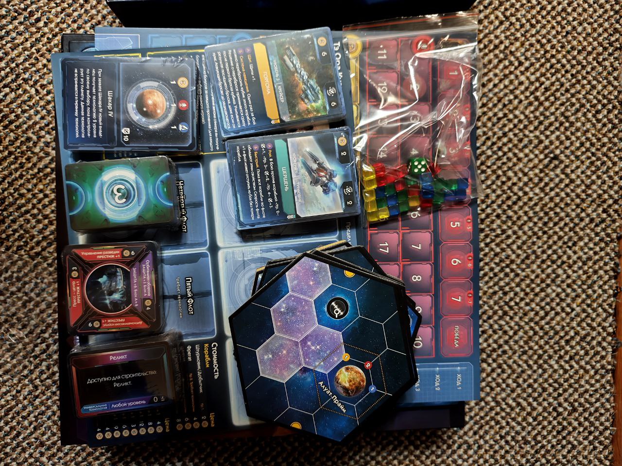 «Амбиции Космоса» — настольная стратегическая игра для компании от 2 до 4 человек, включающая в себя вариативное тактическое поле, карты кораблей и улучшений, счётчик ресурсов и кубики