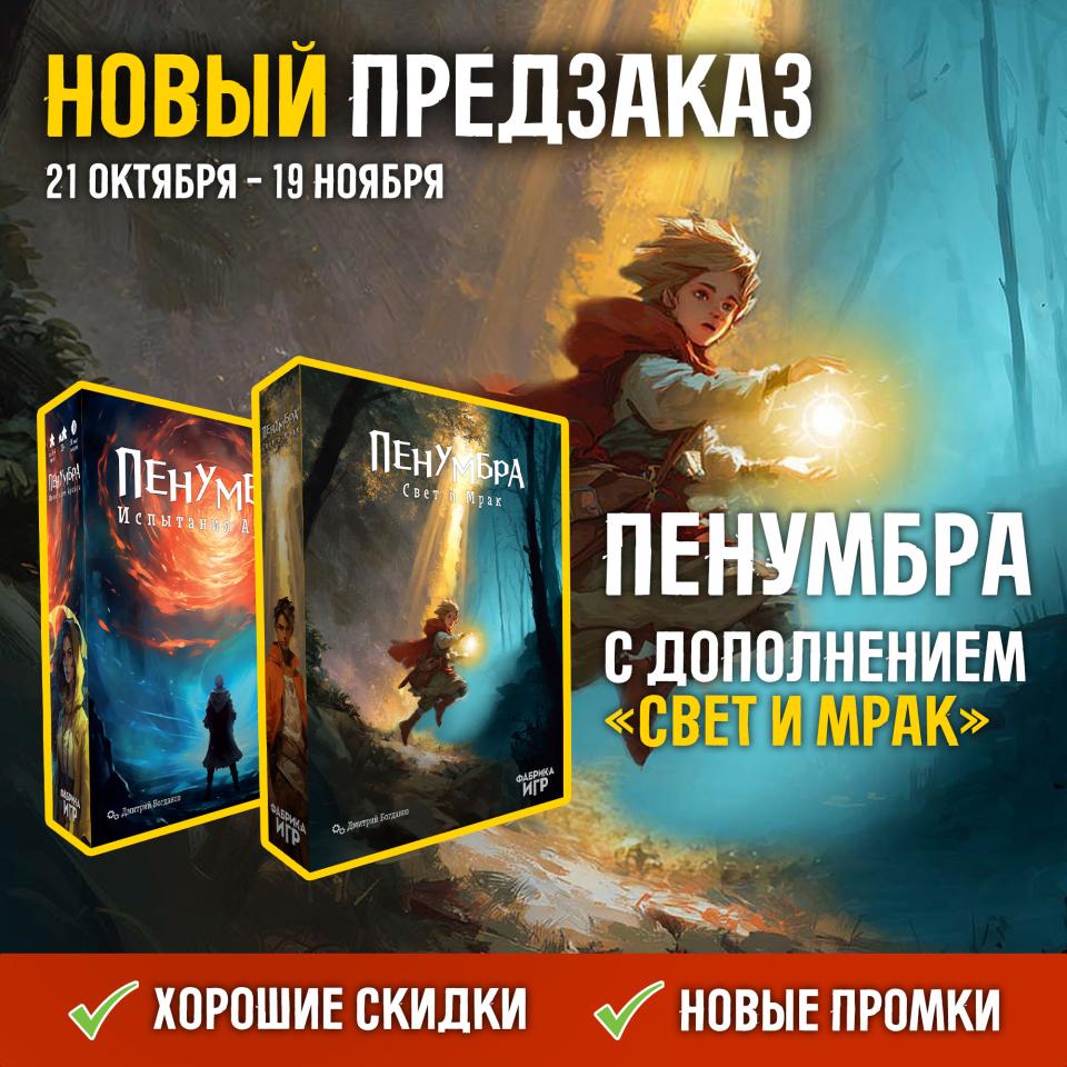 Фабрика Игр 22.10 в 09:00 автор Вера (Verochka) Бабчинская Открыт предзаказ на дополнение к игре "Пенумбра" - "Свет и мрак"! Открыт новый предзаказ на настольную игру «Пенумбра» и дополнение к ней от российского автора Дмитрия Богданова! предзаказ фабрика игр дополнение Евро игра Пенумбра свет и мрак волшебники 164