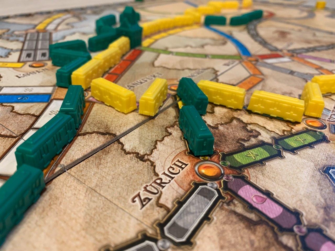 Ещё одна игра на все случаи жизни. Здесь игроки прокладывают маршруты на карте. В ходе игры вы будете собирать карты с цветными вагончиками и строить перегоны соответствующих цветов. Очки начисляются за соединённые города и проложенные в соответствии с картами целей маршруты. Рекомендуется начинать знакомство именно с Европы, где добавляются паромы, туннели и станции, и карта посимпатичнее.