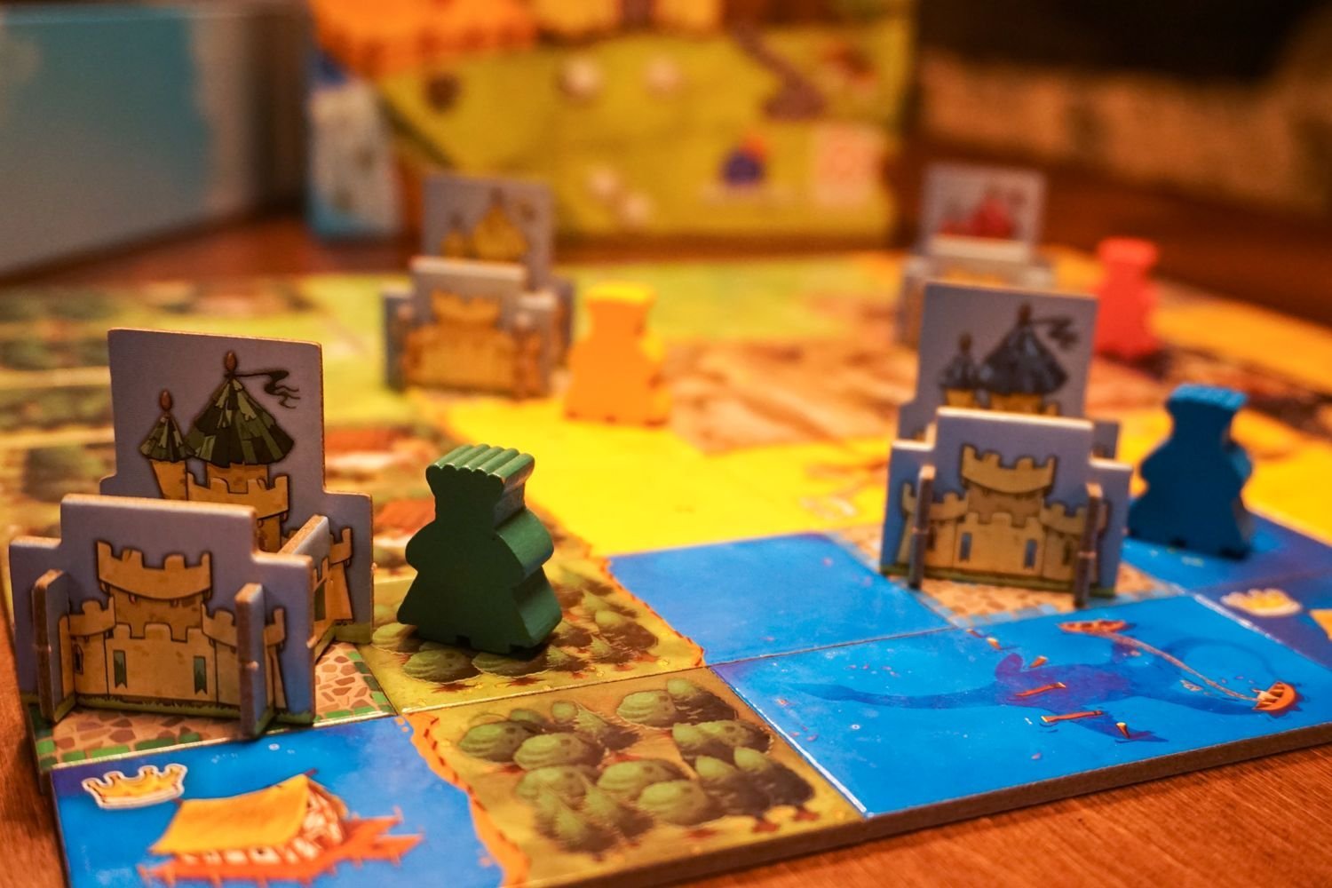 Здесь тайлы прямоугольные, из двух квадратов. Для победы нужно собрать королевство 5х5 и в процессе за эту площадь выходить нельзя. Получается такое подобие Каркассона с примесью тетриса. В конце игры очки насчитываются за каждую область с одинаковым ландшафтом, как произведение количества квадратов и корон. Игра очень яркая и хорошо подходит для досуга с детьми.