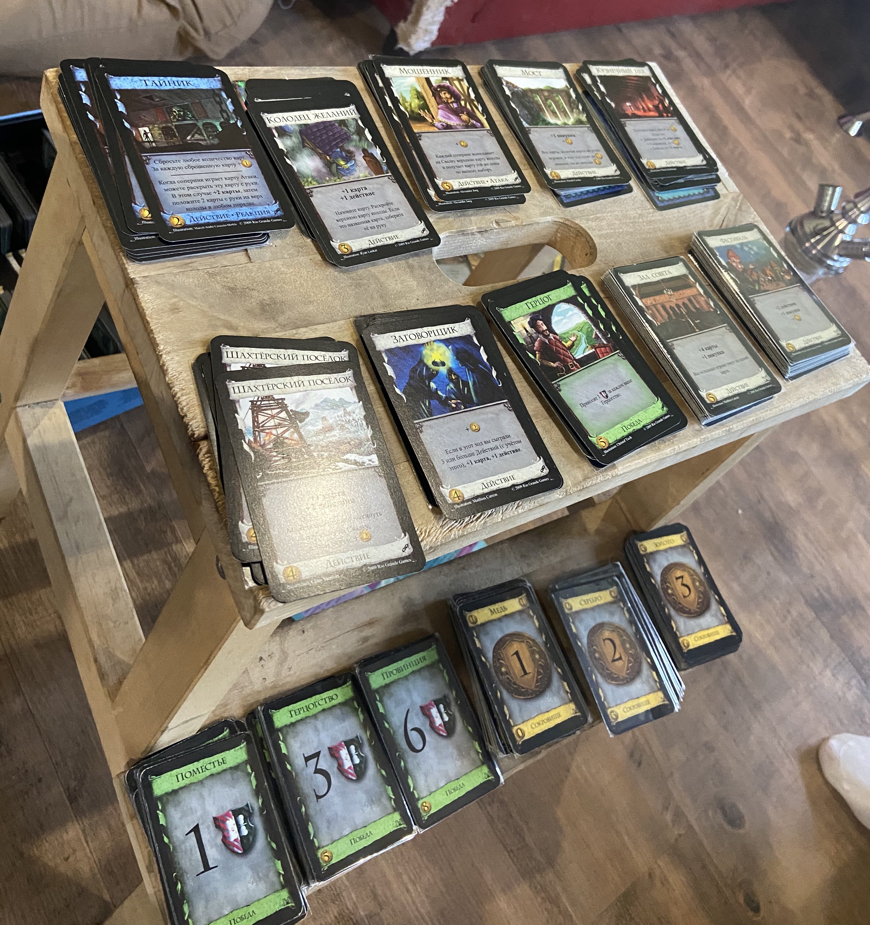 Классический колодострой. Каждый ход набираете в руку пять карт, выполняете действия и покупаете ещё. Цель — заполучить как можно больше карт с победными очками, которые, увы, в процессе игры только занимают место в руке. Какие типы карт будут участвовать в игре можно выбрать по предложенным раскладам, решить самим или набрать случайным образом. Каждая партия особенная, с дополнениями вариативность просто огромна.
