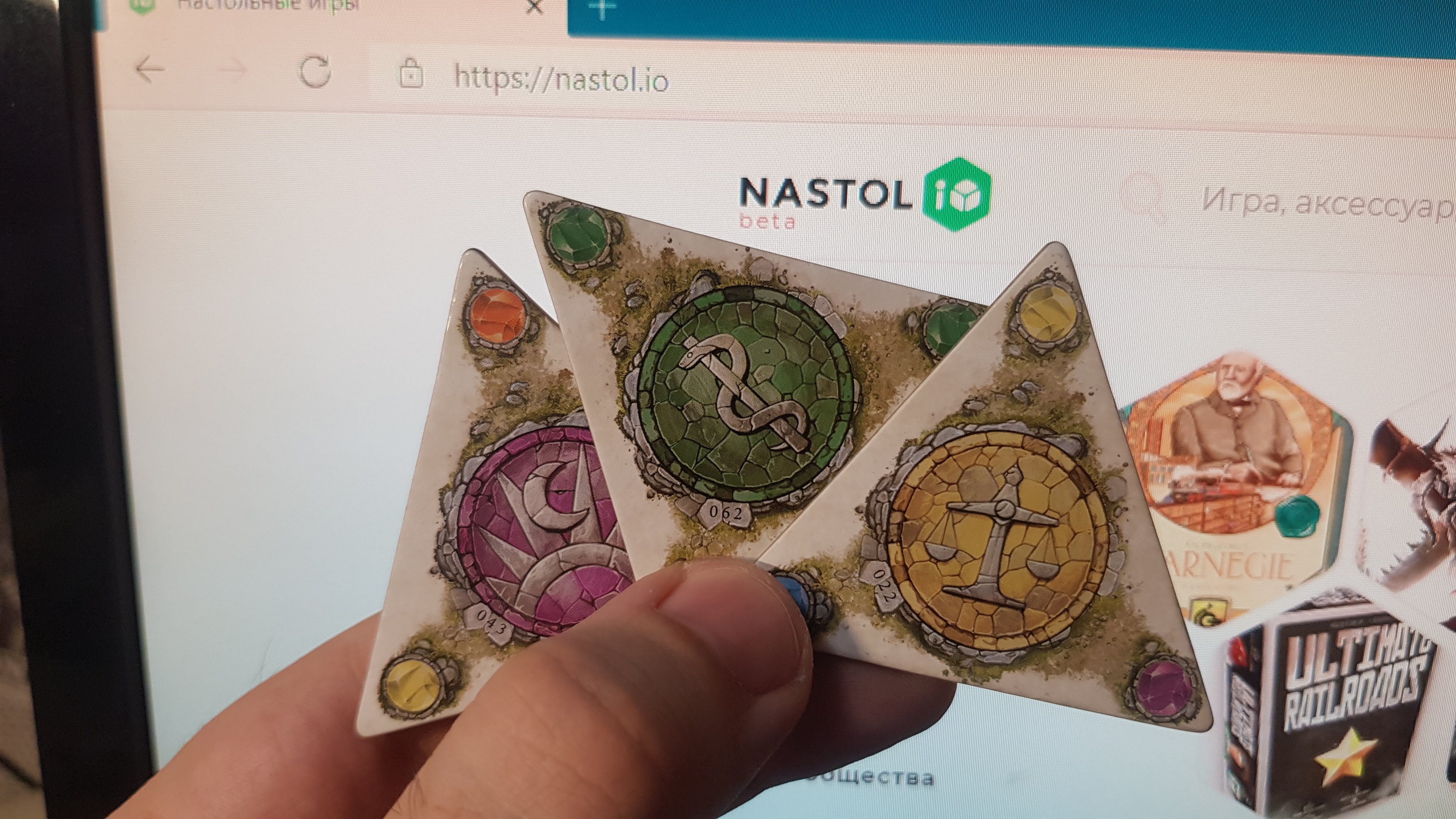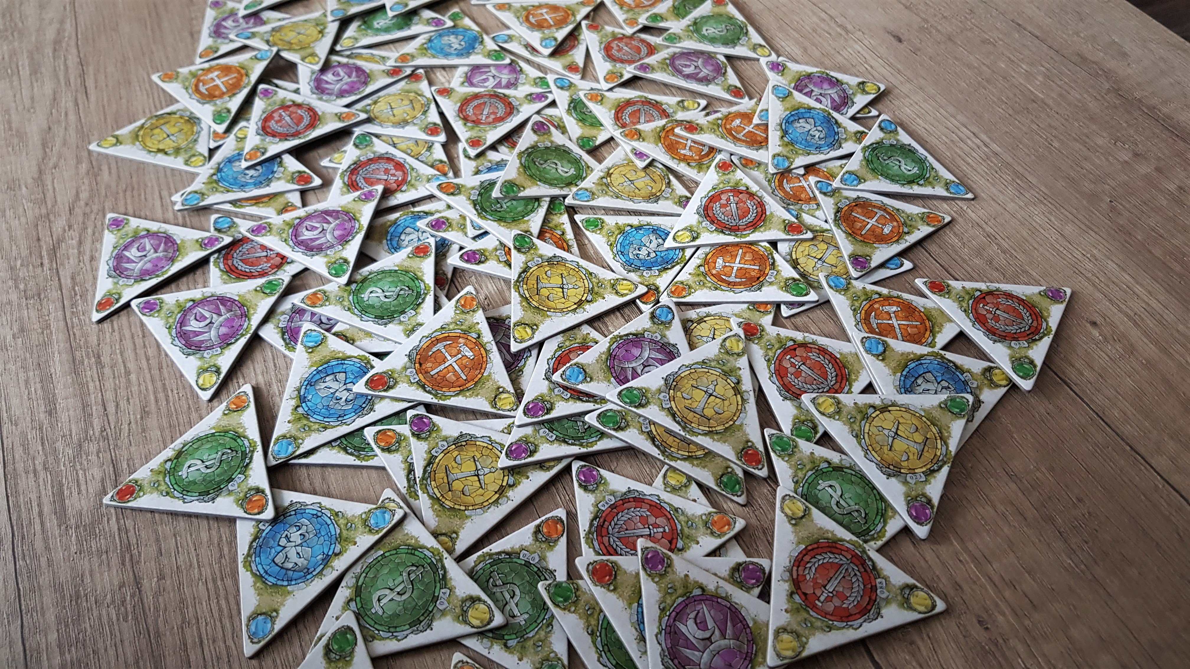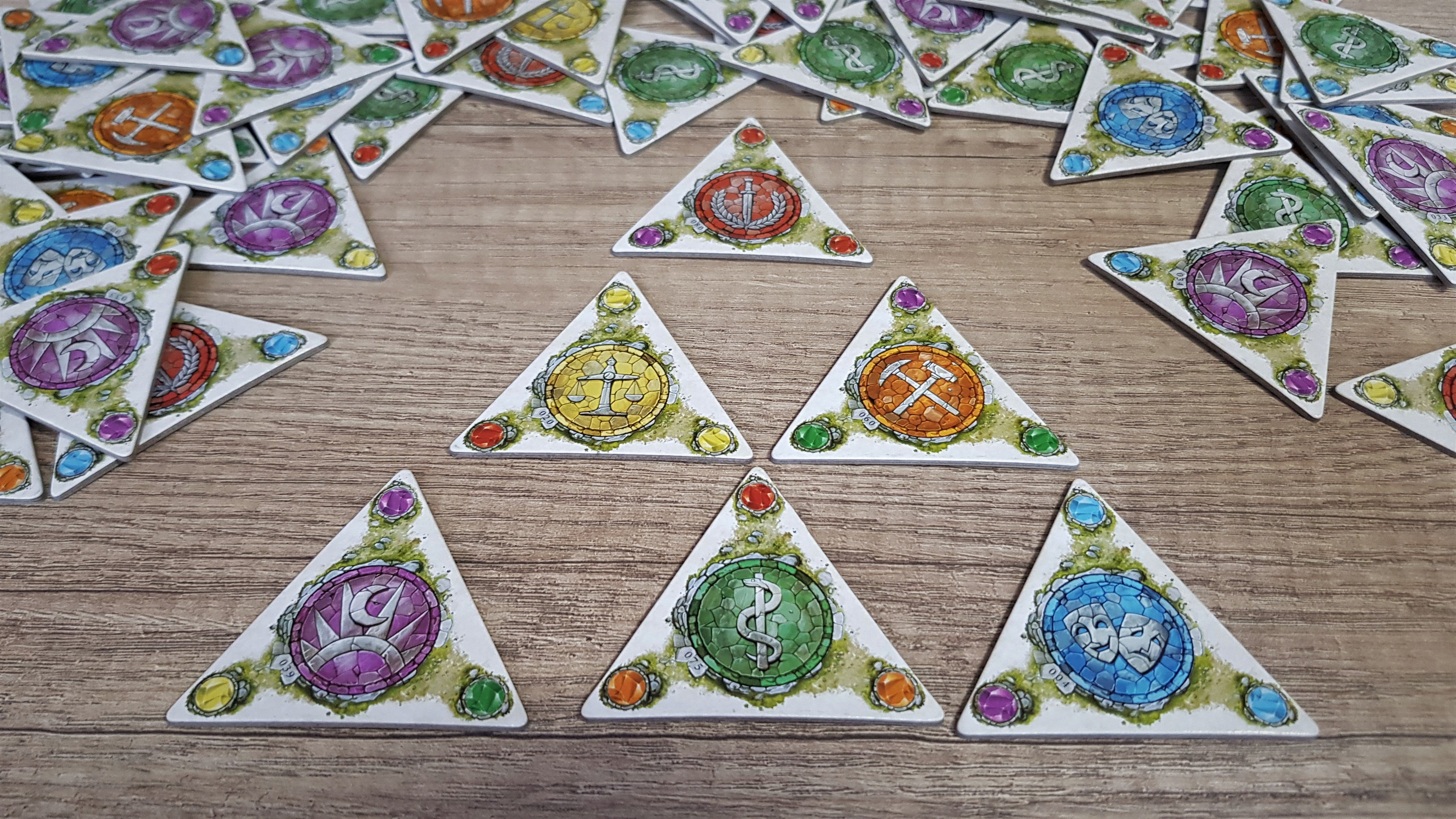 У нас на руках 7 треугольных тайлов, а в центре стола большой многогранник, олицетворяющий некую "колыбель человечества" к которой мы будем поочередно пристраивать наши треугольнички. Тем самым мы как-бы совершаем абстрактные открытия новых территорий и получаем знания в разных сферах мастерства (зависит от того, какого цвета вершины и цетральный "кэмп" пристыковывающегося тайла). Это так называемая фаза "ПРИРОСТА ТЕРРИТОРИИ" и ее не возможно пропустить.