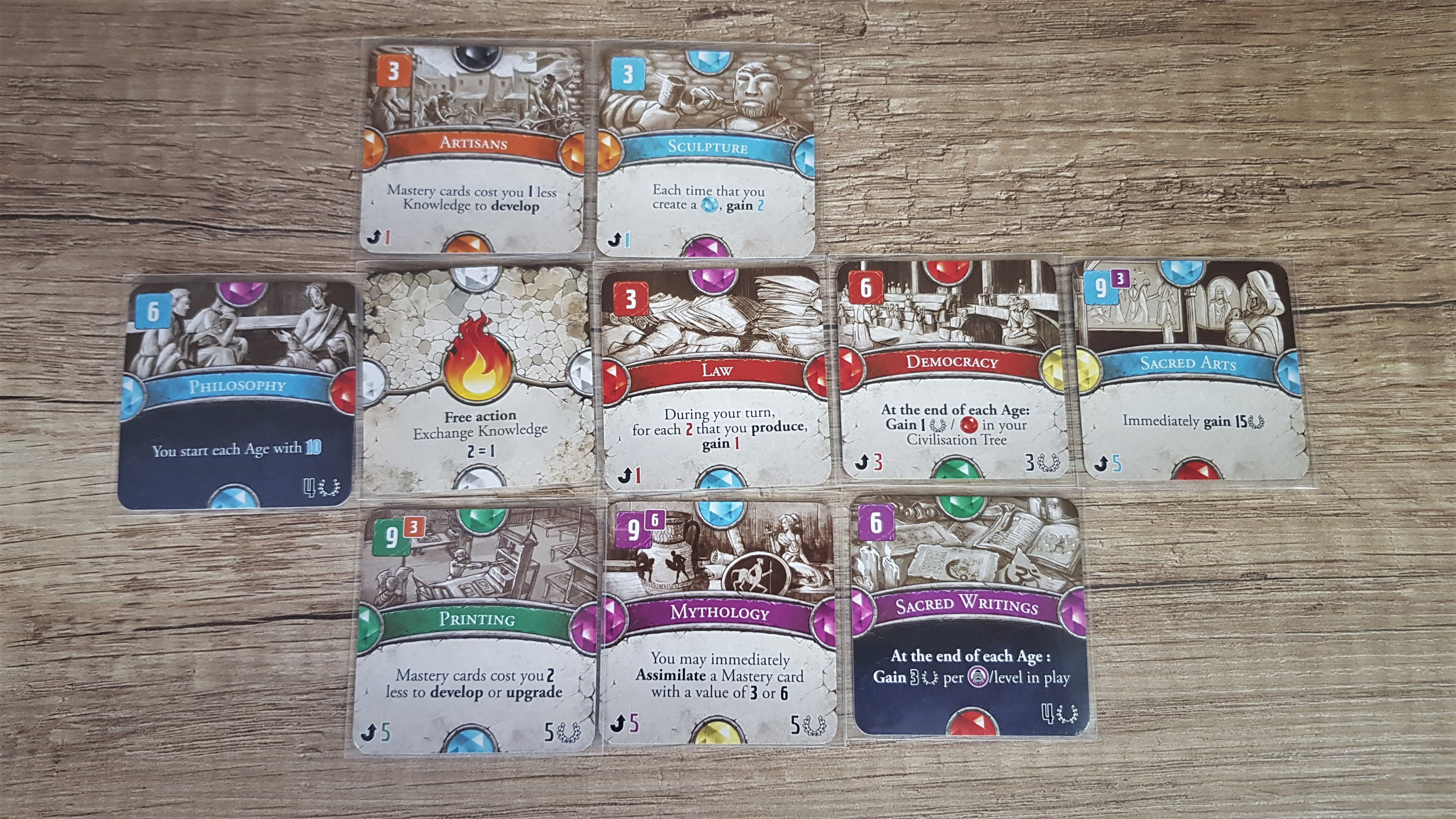 "Исскуство" же наоборот концентрируется на монументах (чудесах). Дает скидку в 2 ресурса на строительства чудес. Награждает победными очками в конце эпохи за твои города рядом с монументами, либо за карты монументов построенные тобой. Дает просто чистые очки в большом количестве. Дает очки влияния за карты монументов в твоем дереве технологий.