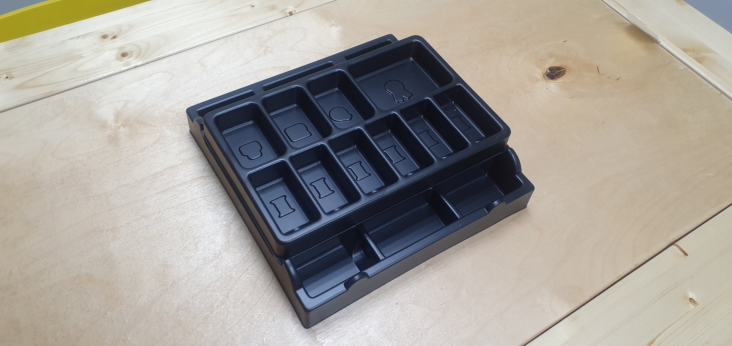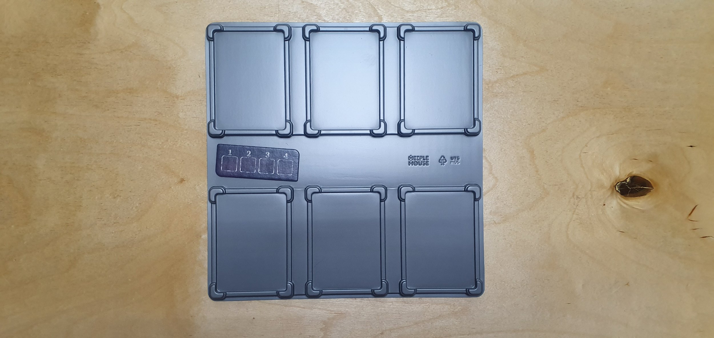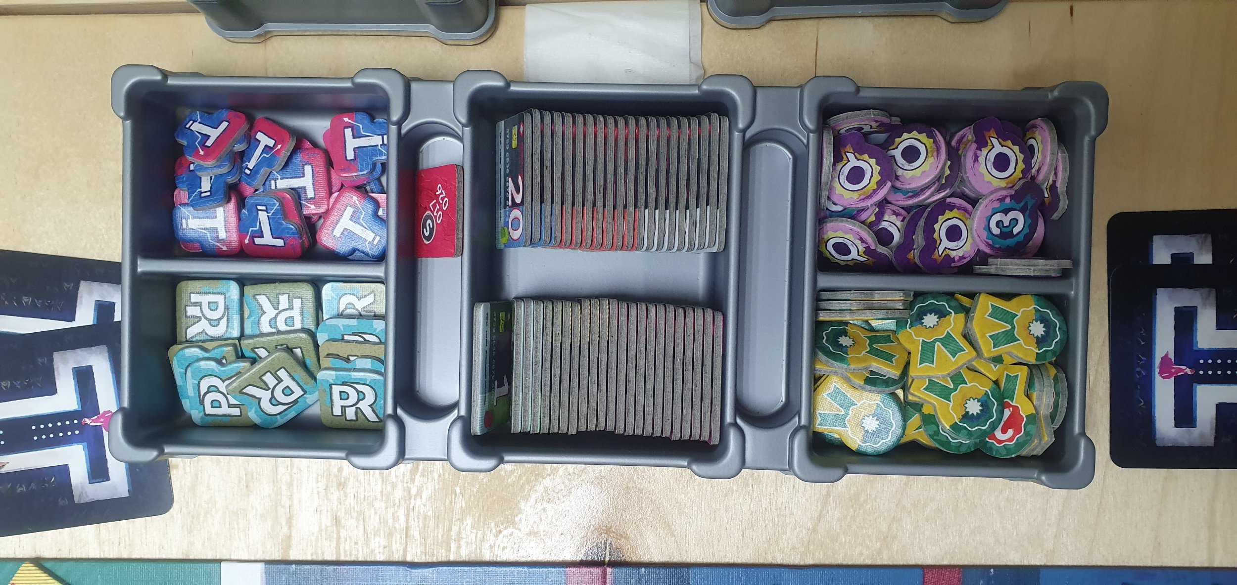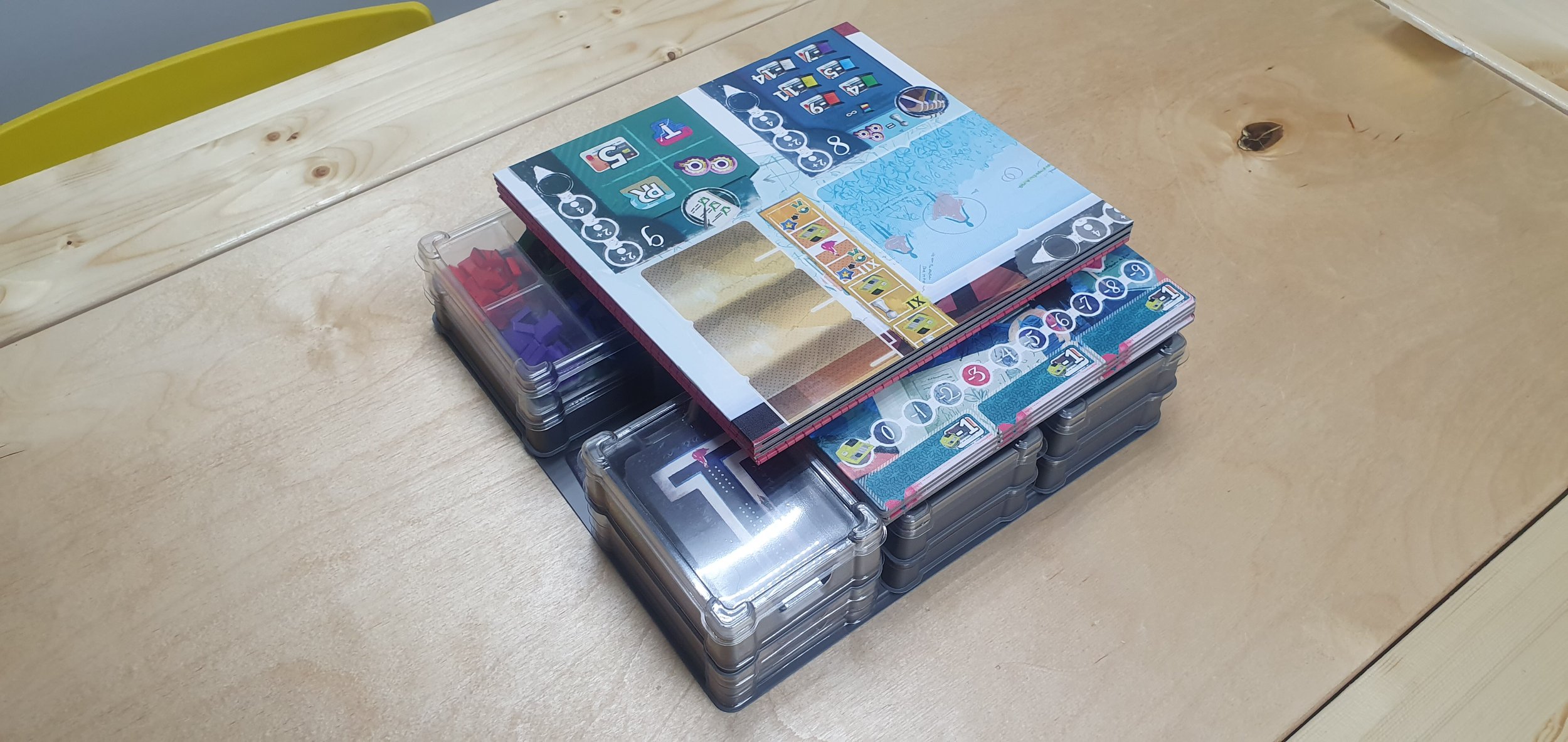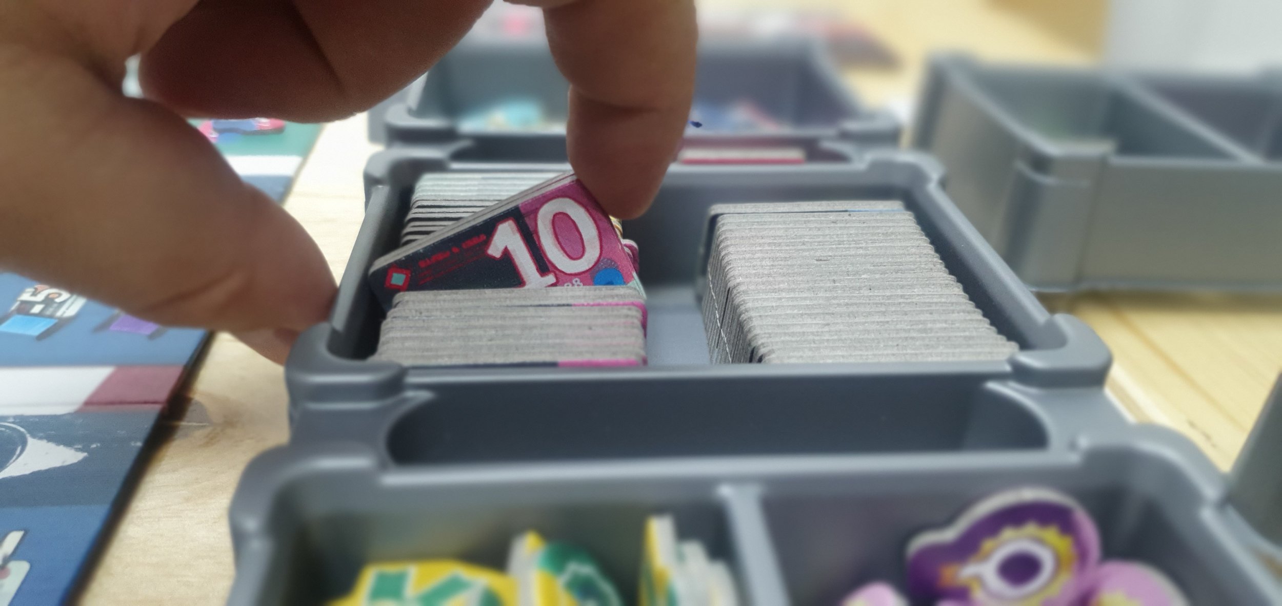 За счет того, что башенка в стаке немного выше двух обычных модулей по высоте, здесь удобно укладываются планшеты игроков. Но на самом деле одна половина органайзера получается на несколько миллиметров выше другой. Это видно по тому, как лежит сложенное поле. И здесь можем дружно ожидать от Meeple House анонса решения с заниженными по высоте модулями, так как именно их здесь и не хватает. Карт в игре не много, поэтому обычные модули тут чрезмерны. Можно смело заменять пониженной высотой все UTS M04 TWO и UTS M01. Это позволит уложить все очень аккуратно и ровно, и крышка будет закрываться полностью.