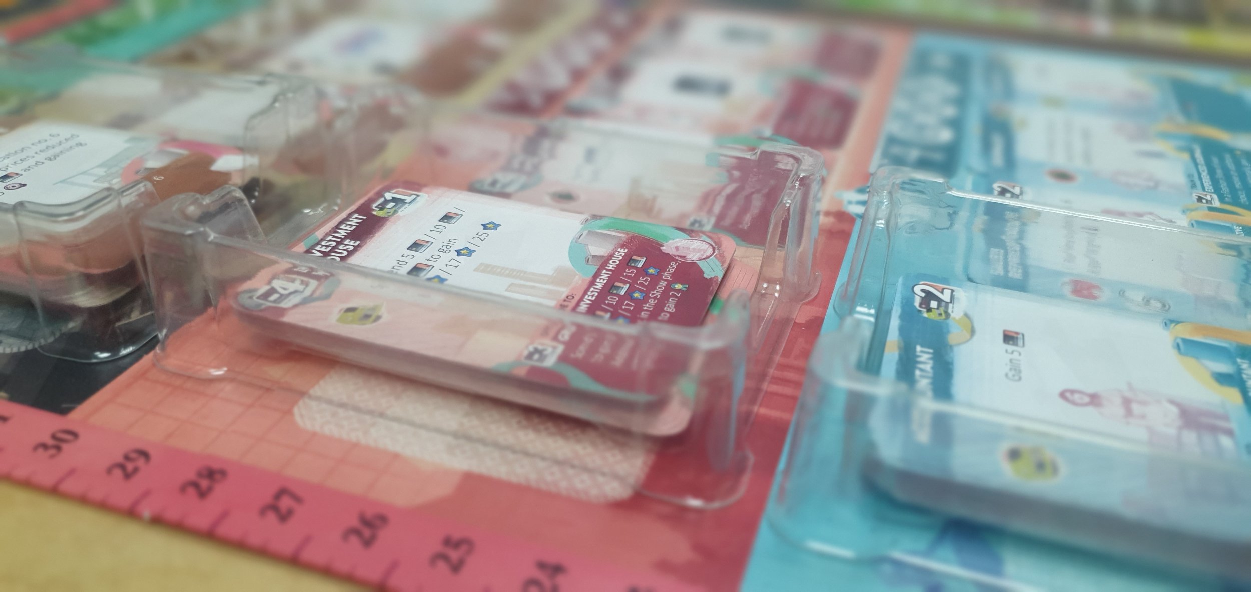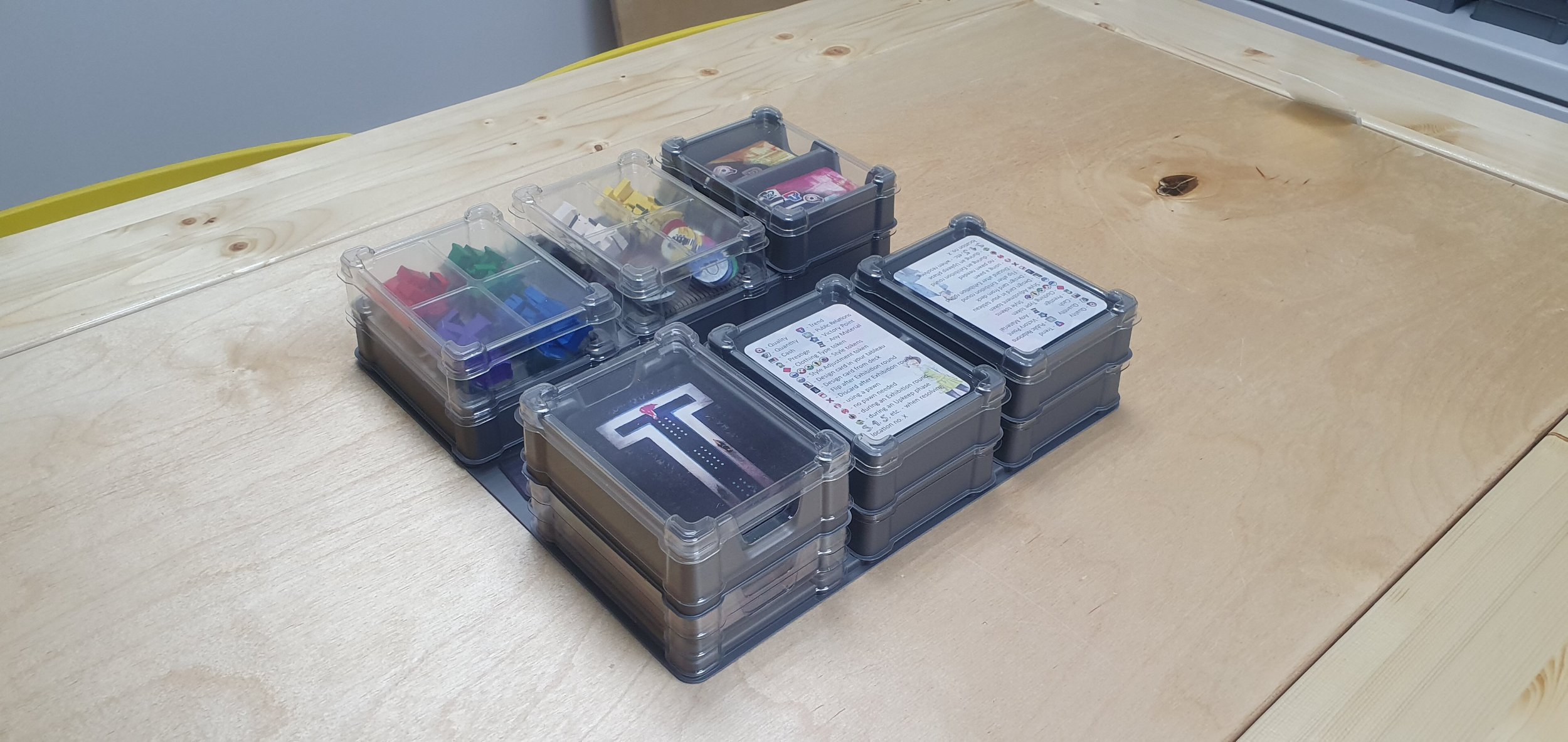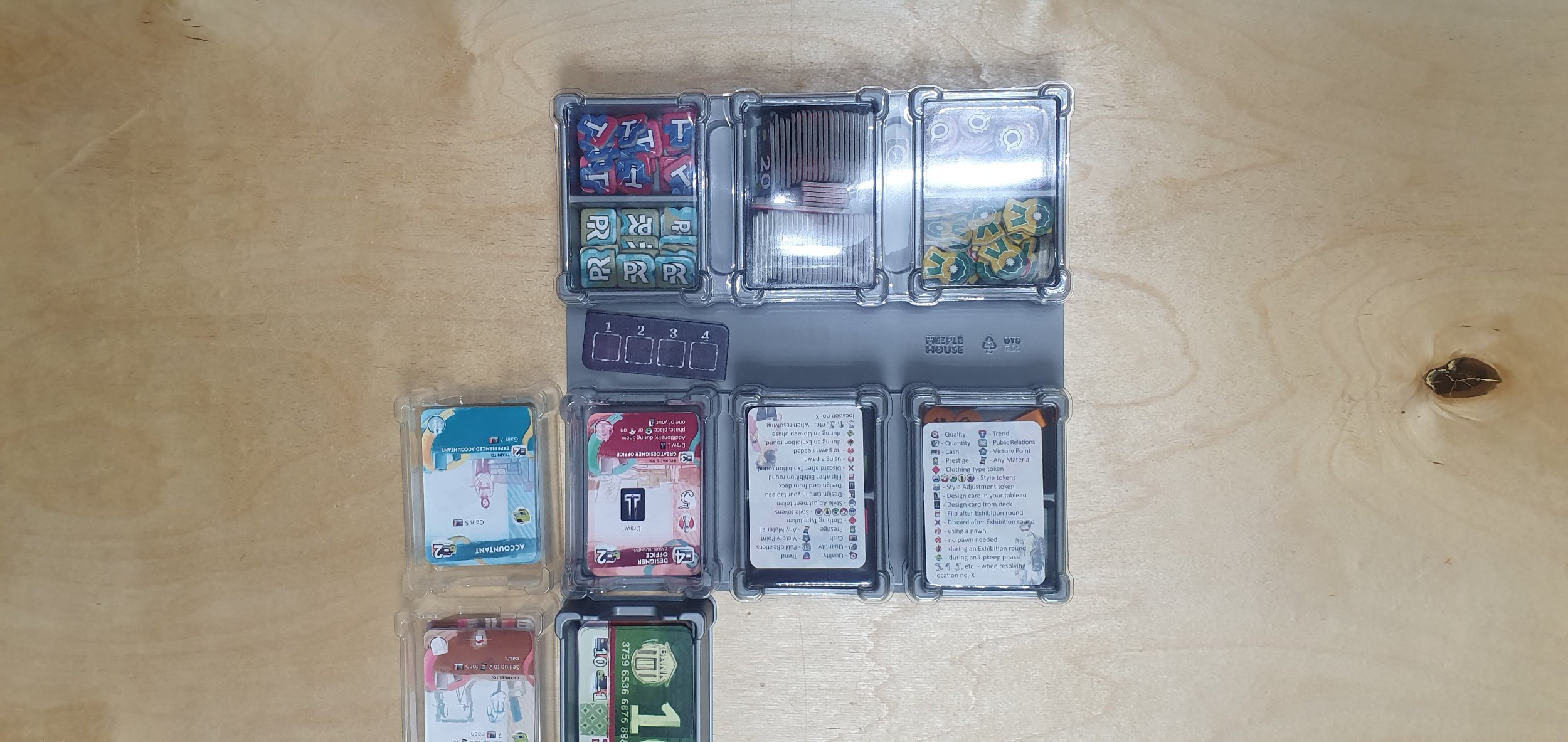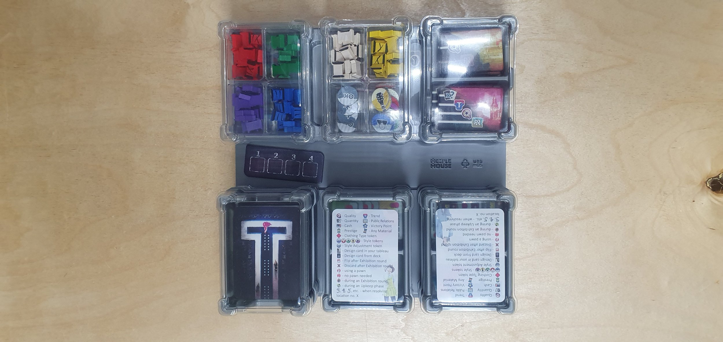 И еще одно важное замечание. Когда Meeple House анонсировали прозрачные модули, я был скептичен, так как серые модули все же хорошо выделяют лежащие в них компоненты. Если прозрачные модули и применимы, то в редкий случаях. И Прет-а-Порте стал именно таким случаем! Когда нужно карты или жетоны уложить прямо на отведенное место на игровом поле, нет ничего лучше прозрачных модулей. Здесь они показали себя на все 100%. Поэтому именно для этой игры я бы рекомендовал брать исключительно прозрачные модули. Нельзя закрывать такое красивое оформление!