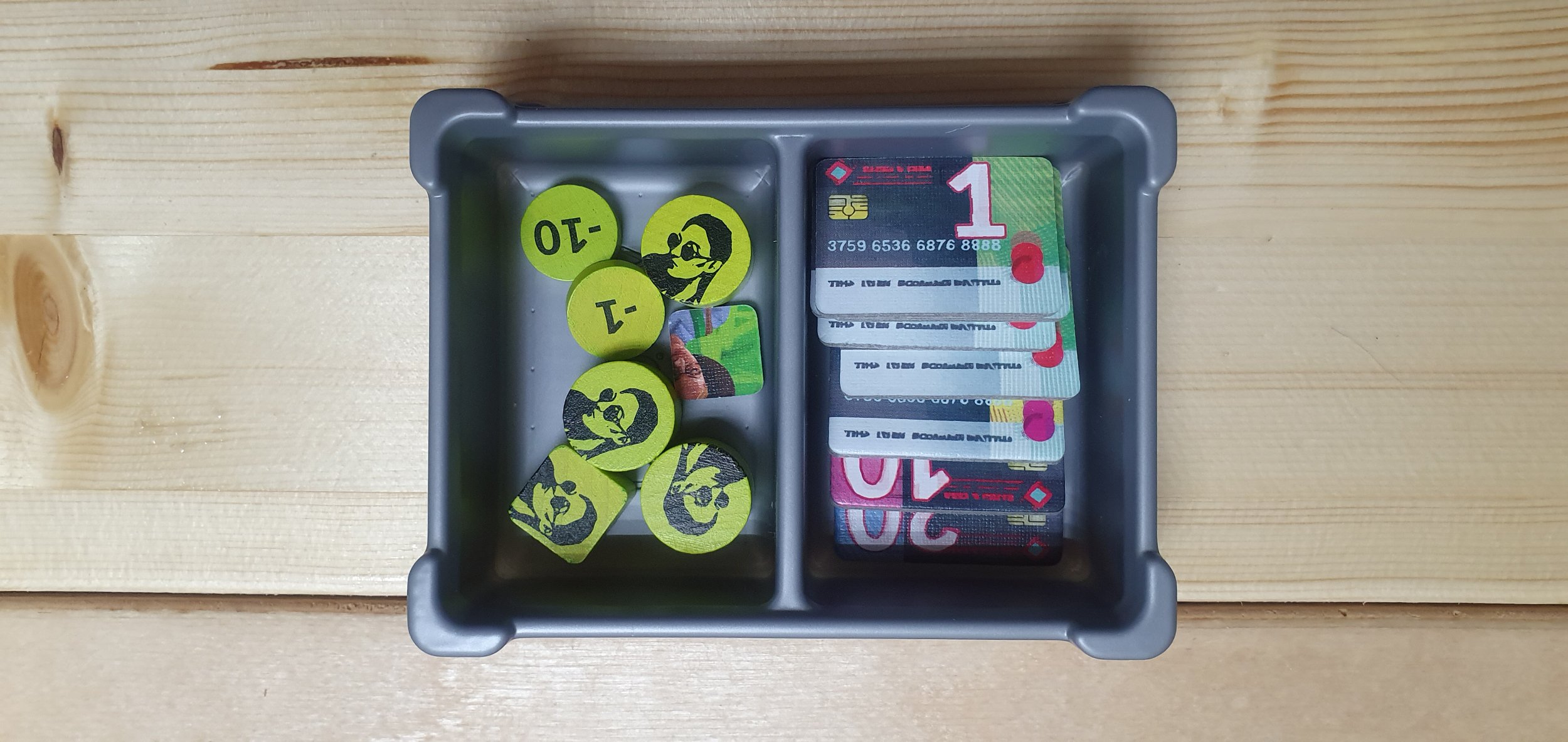 В центральной ячейке получается удобная картотека денег. Во время хранения между двумя половинками хранятся жетоны первого игрока и типов одежды. Во время же игры они в действии и не мешают, а деньги легко достаются, если потянуть за уголок. Если во время игры аккуратно брать и класть деньги на место (как кассиры, раскладывая их по номиналу), то выходит удобная касса!