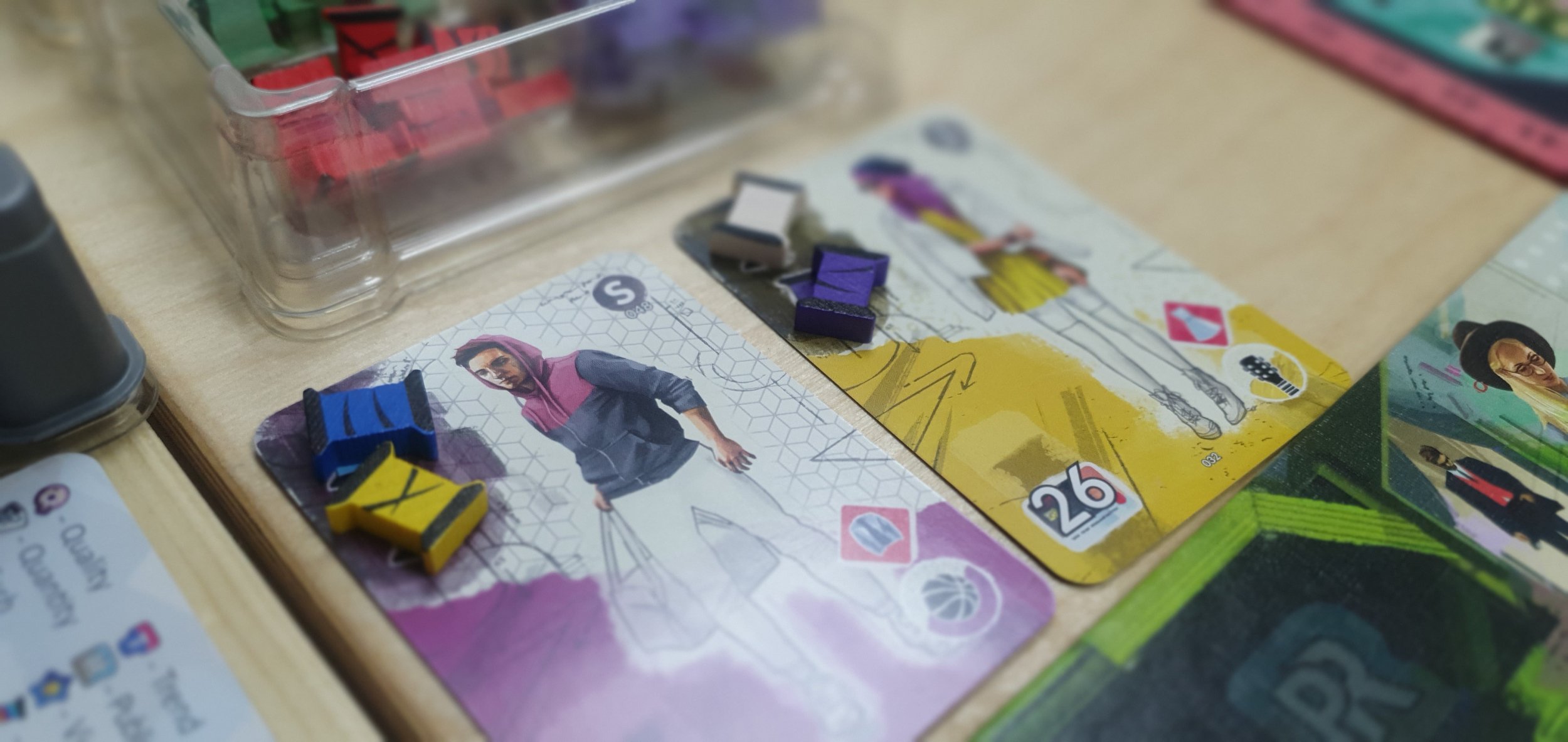 Игра длится 4 квартала по 3 месяца, то есть целый игровой год (ну или примерно 1,5-2 часа реального времени). И здесь закладывается основная реиграбельность, так как то, как именно мы будет зарабатывать победные очки в текущем месяце (раунде), определяется при сетапе игры рандомным раскладыванием плашек «Показа мод». В остальном, Прет-а-Порте представляет из себя игру на построение движка с размещением работников: нам нужно за первые раунды так построить свое производство, нанимая работников, арендуя здания и заключая контракты, чтобы перед ближайшим показом мод заработать максимальное количество Престижа и денег, которые в последующем конвертируются в победные очки.