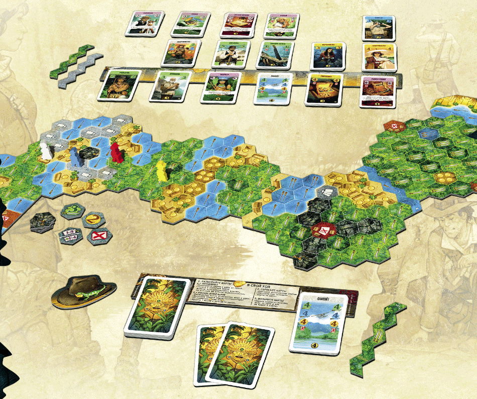 Способ разнообразить и без того хорошую игру, а ещё карты с отсылками к известным героям. Можно заказать комплектом с базой. В поисках Эльдорадо — признанный хороший колодострой с элементами гонки. Это не только карты, но и модульное поле, по которому передвигаются игроки.