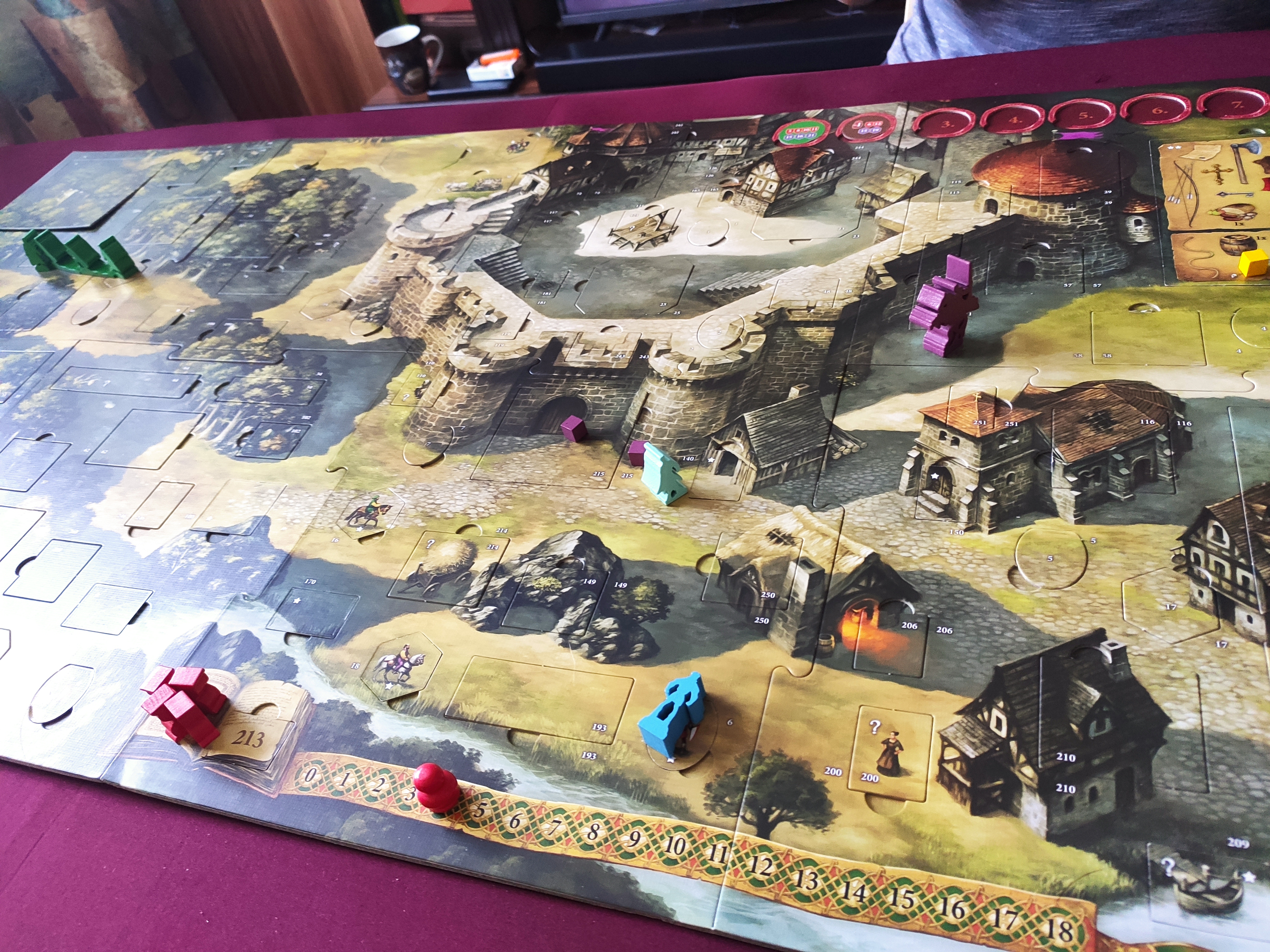 Итак, коробка куплена и вскрыта... Посмотрим, что внутри, а внутри скрывается двухслойное составное, наподобие пазла, поле с кучей секретов. А секреты - это жетоны самых разных форм и размеров, которые потребуется открывать и переворачивать в ходе приключений. Здесь таится первый подвох, поле настолько плотно собрано-подогнано, что первое извлечение лучше провести заранее, ещё до первой партии, иначе рискуете испортить жетон. В защиту игрового поля скажу, что если опустить этот нюанс с жетонами, само оно вызывает восторг от качества печати, перевернутые жетоны идеально встают на свое место в общем рисунке. А ещё оно большое, на журнальном столике не поиграешь. Что дальше, а дальше нас ждёт настоящая книга приключений, толстенькая, в твёрдом переплёте, плотной бумагой и парой закладок. Листать книгу просто так строго не рекомендуется, здесь каждая страница и каждый абзац важен. Так, что если не хотите узнать чего лишнего, то прислушайтесь к моему совету. Кроме того, в коробке ждут, так классно постукивающие друг о друга, деревянные компоненты. Это и умопомрачительное количество маленьких кубиков разных цветов, и диски, используемые для определения очерёдности хода, и песочные часы, отсчитывающие время, и, вишенка на торте, наборы резных миплов (ваших и неигровых персонажей). Остановимся подробнее на миплах. Каждый игрок получает набор из пяти миплов - две стоящие фигурки, две идущие (те, у которых хвостик короче) и одну бегущую. Зачем так много? А все потому что в игре реализована механика свободного перемещения, здесь нет ни клеточек, ни областей. Для нас этот приём в новинку, но он интересен и даёт гибкость в перемещении. Давайте подробнее остановимся на этом. Карта местности очень богата на детали, здесь есть проходимые и непроходимые места, первые, в свою очередь, делятся на освещенные и нет. В игре вам надо будет перемещаться по дорогам через лес, сплавляться по реке на лодке, вы сможете побывать в деревне или даже попасть за крепостные стены. Передвигаясь по карте, ваш мипл должен огибать не пересекая непроходимые места, шнырять под носом у стражников и прятаться в тени. Так вот, чтобы выполнить передвижение вы должны выстроить траекторию, используя набор миплов, цепочка должна начинаться и заканчиваться фигуркой стоящего персонажа. В зависимости от того использовали ли вы бегущего мипла, вы бережёте или нет свои силы, каждый раз, когда мипл остался на месте или передвинулся без бега, ваш мешок пополняется одним белым кубком, что позволить вам в дальнейшем легче пройти проверку.