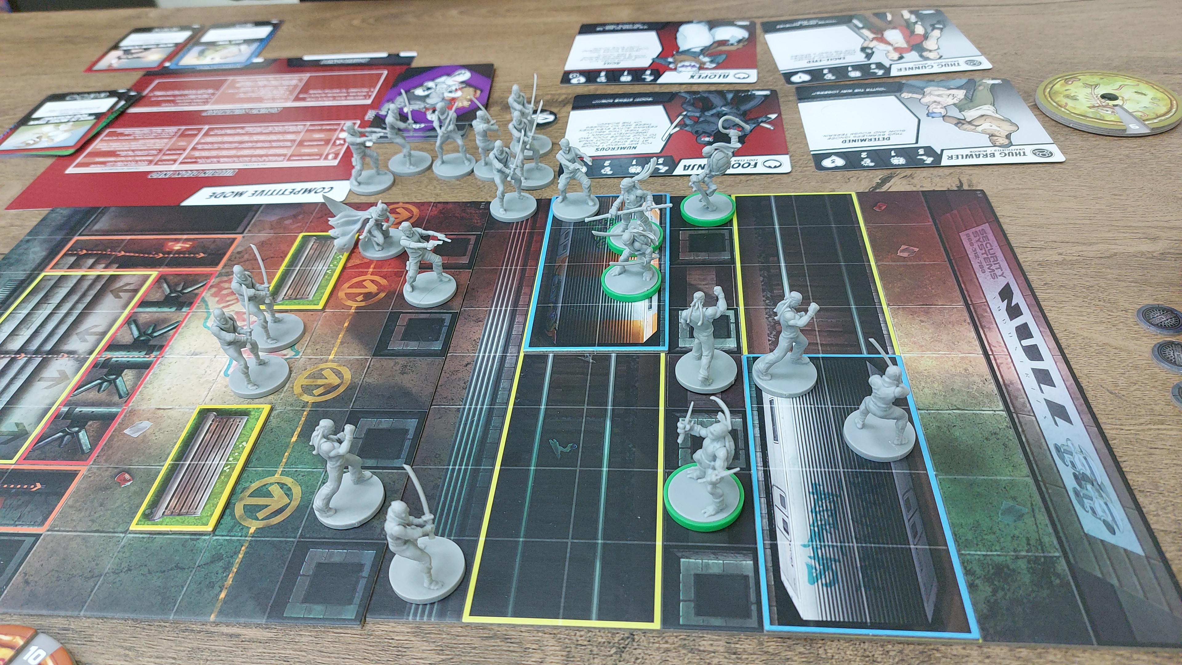 Играли втроём: оверлорд за злодеев и два игрока по две черепашки у каждого. Если кратко, то некоторые изъяны или лучше сказать моменты слабенького геймдизайна видны прямо в процессе ознакомительной партии. Вроде бы механически и тематически ничего не режет глаз, но некоторые решения откровенно слабые, как будто в некоторых местах авторы решили, ну всё дальше лень заморачиваться. Если что, франшиза подтянет. В качестве подтверждения, сам владелец коробки немного разочаровался от этих моментов.