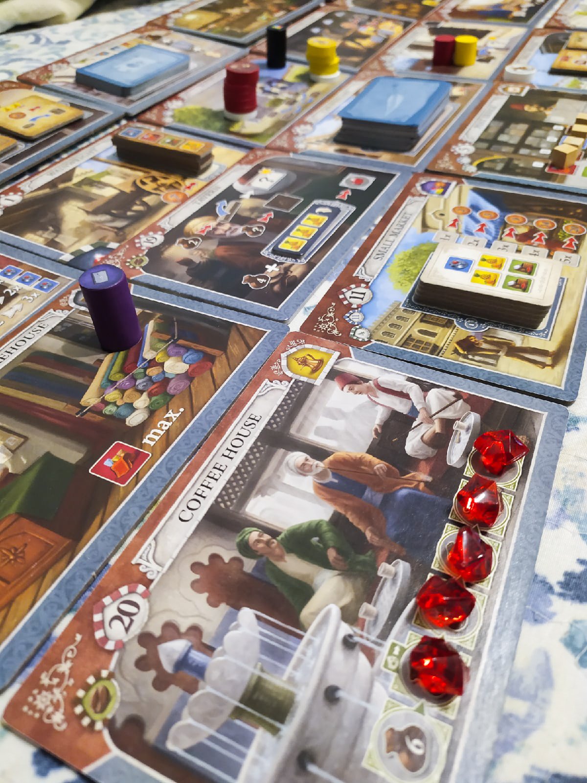3) Стамбул. Проигнорировала ее, когда в Беларуси можно было купить локализованную, пришлось брать на английском, зато с 2мя дополнениями. Как и в предыдущей игре – разнообразие в каждой партии, большое количество совершенно разных действий доступно в ход. Немного напрягает, что игра именно гонка, хотелось бы просто играть на очки, чтоб она так быстро не заканчивалась. Играется за полчаса вдвоем. И модуль с кофе (Mokka und Bakschisch) нравится чуть больше, чем с письмами (Letters and seals). А модульное поле – выше всех похвал, ни одной похожей партии!