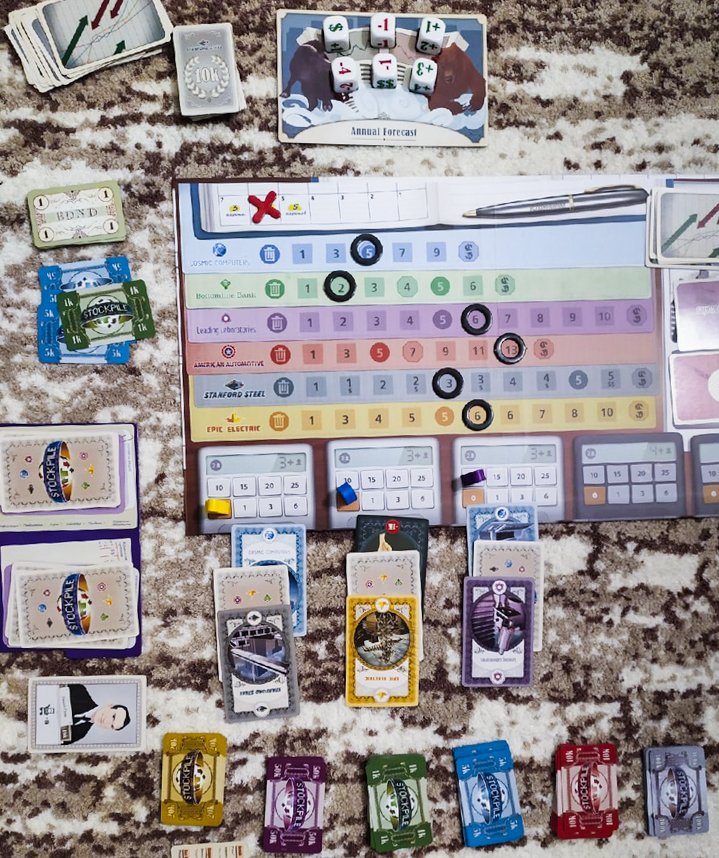 8) Биржа (Stockpile). Очень азартная игра! В нее играла вдвоем и вчетвером, но, хотя дуэльный режим и ругают, именно он мне и понравился больше всего, так как в нем больше свобода действий и большее количество карт на руке в итоге. В отличие от игры "вмногером", где ты можешь оказаться с меньшим количеством карт на руке, чем соперники. Дополнение дает еще большее разнообразие: кубики помогают делать события неодинаковыми каждый раунд, покупка товаров и инвестирование – отличные дополнительные источники дохода.