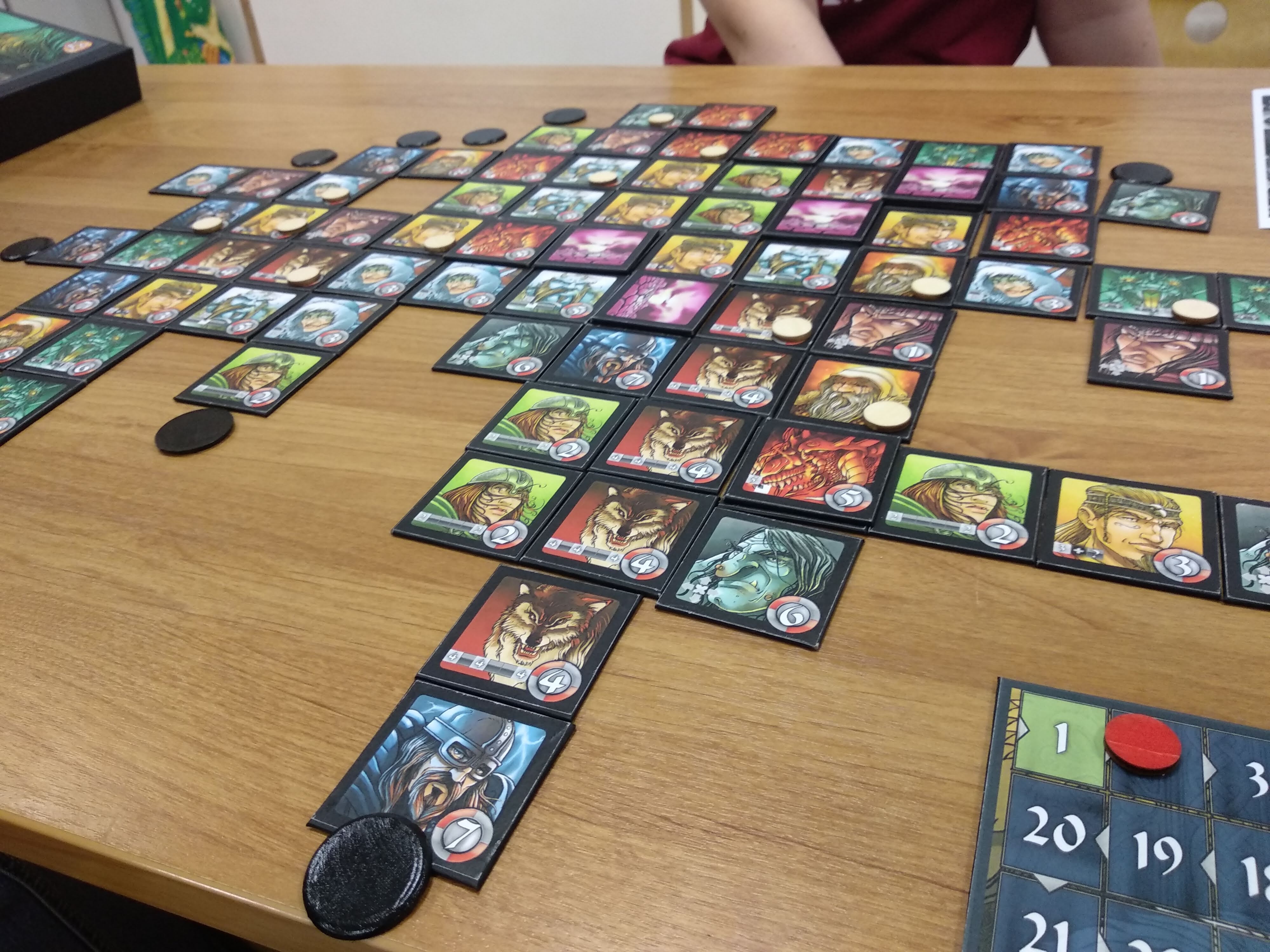 So far, so good… Völuspá. Выкладывание жетонов поля с мгновенным начислением очков согласно успешности выложенного тайла. Приятная мне скандинавская мифология и разнообразные эффекты тайлов привлекли меня и не зря. Игра состоит из тайлов значениями от 1 до 8 с уникальным эффектом каждой цифры-персонажа. По основному правилу игры, начисление очков происходит, если выкладываемый тайл старше всех в ряду и тогда активный игрок получает очков по количеству всех тайлов в ряду.. Также происходит и по столбцу. Ограничение, что ряд не может быть больше 7 и столбец тоже не может быть больше 7. Таким образом в идеальной ситуации можно заработать 14 очков.