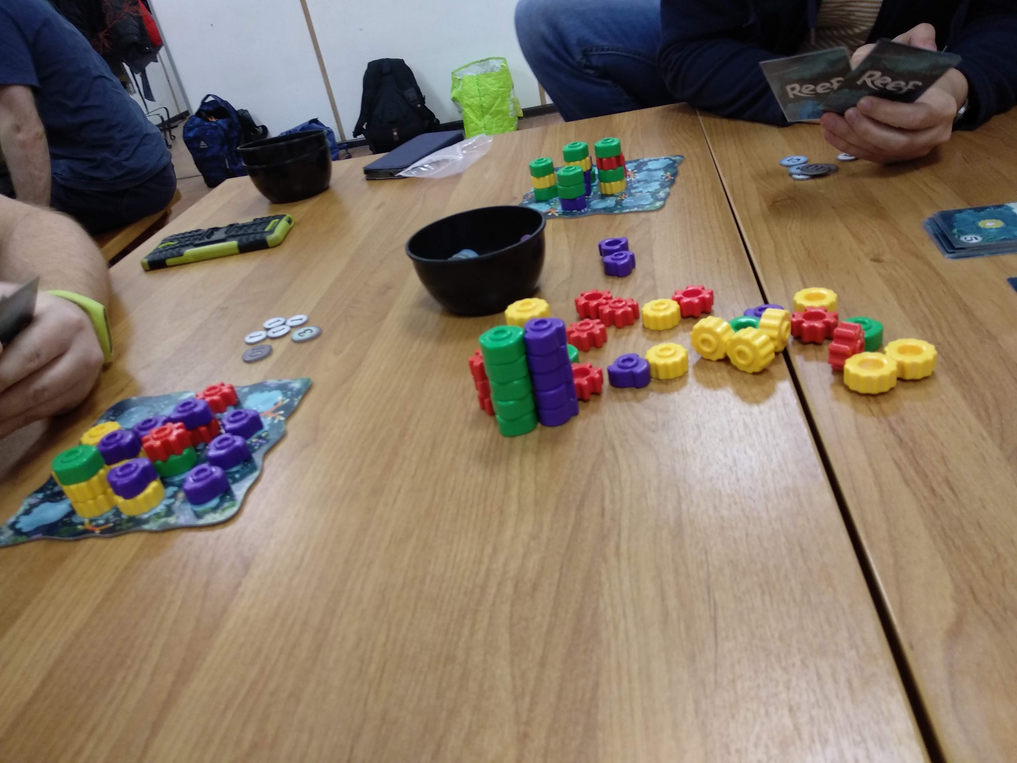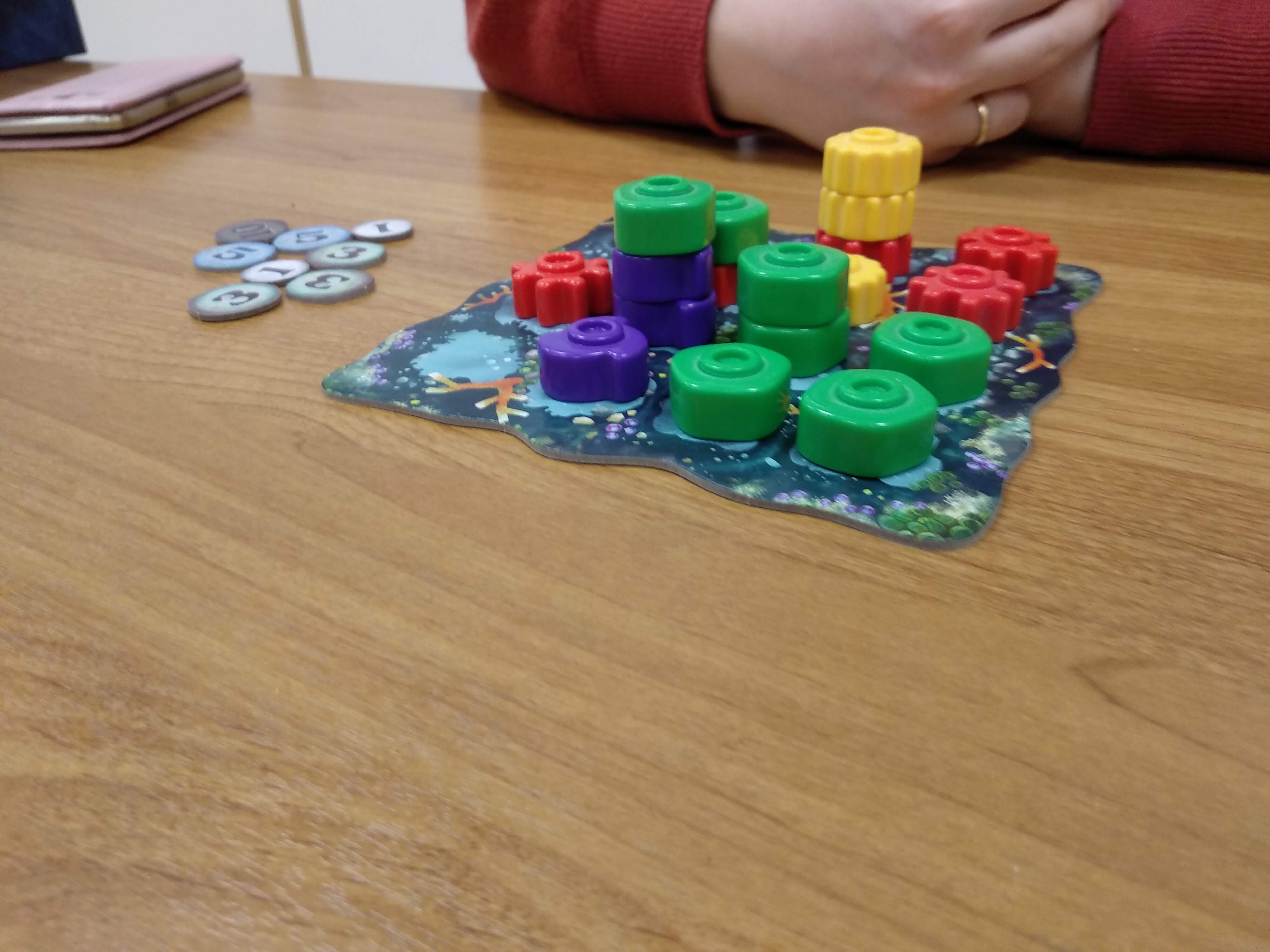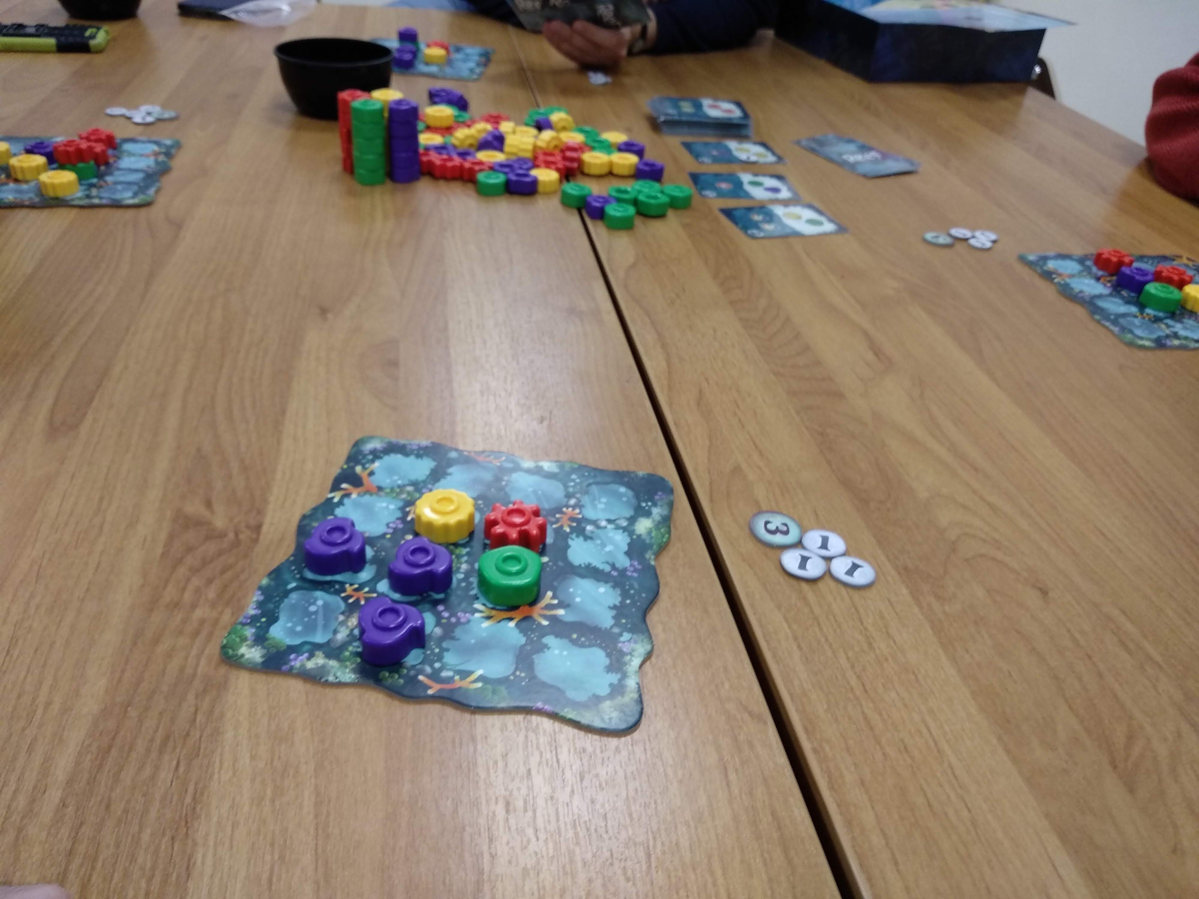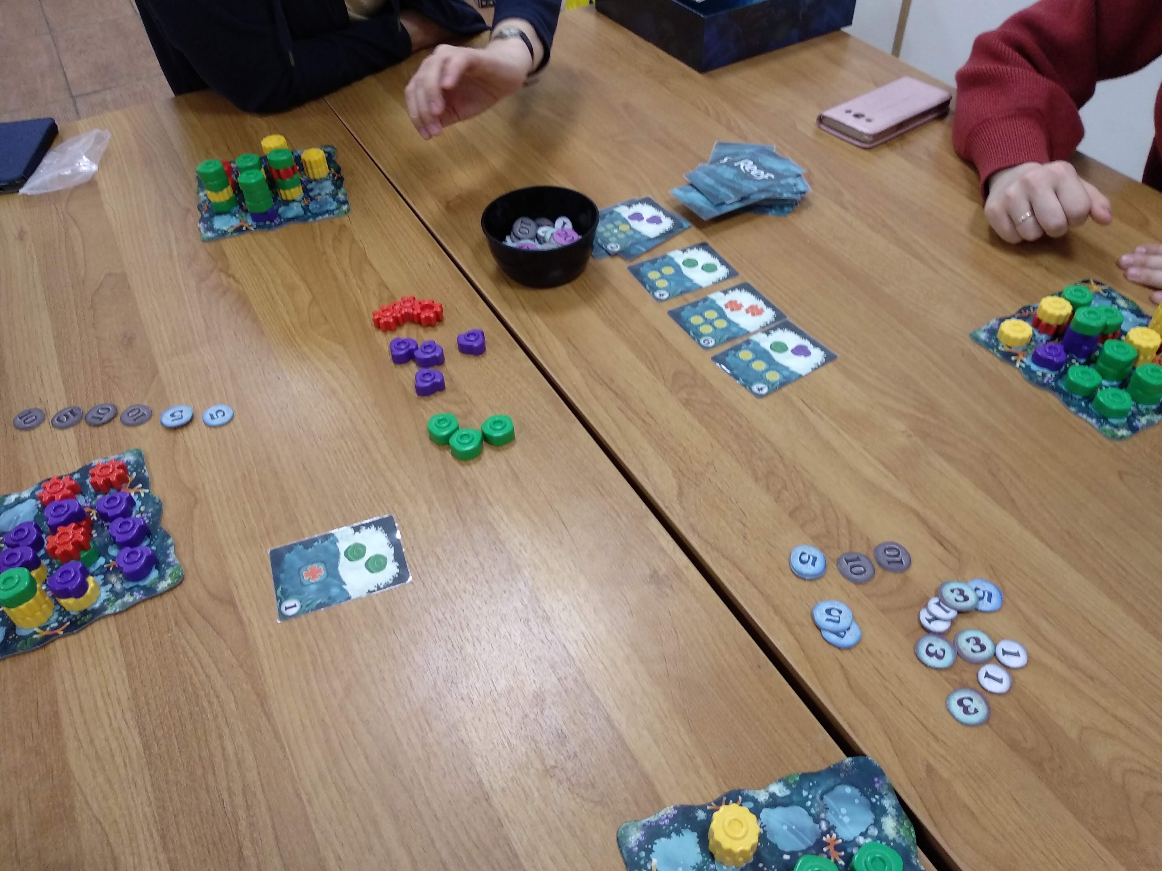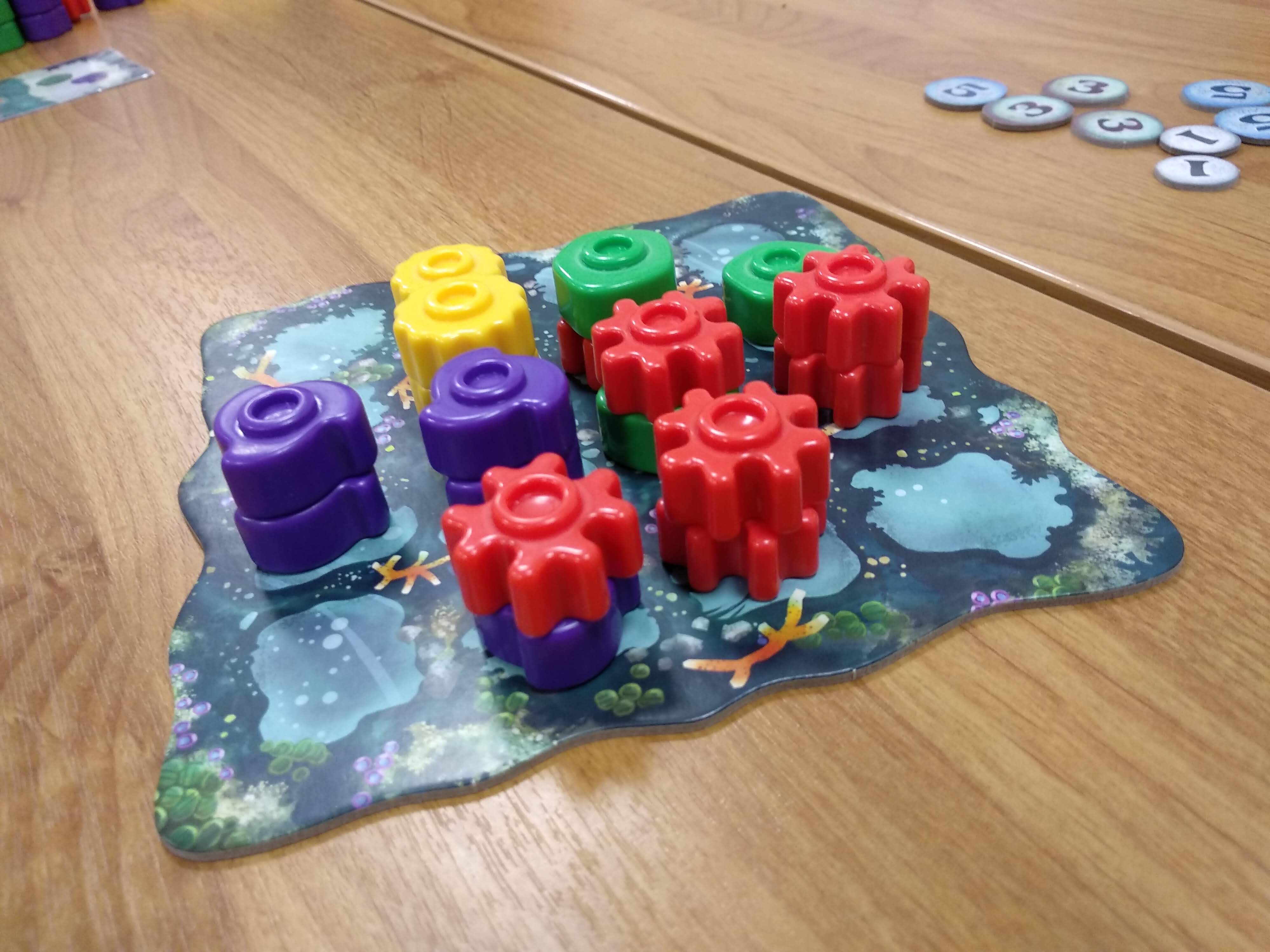 Сеттинг не так важен, потому что игра чисто на механике, но по идее элементы должны заинтересовывать несмышленных детей и затягивать их в настольное сообщество с младых ногтей. Ну вот тут-то этим ребятишкам ногти-то и пообламают, потому что игра требует для победы долговременного планирования, а к общению с другими игроками Reef не подталкивает. Разве что – «опять увели карту!».