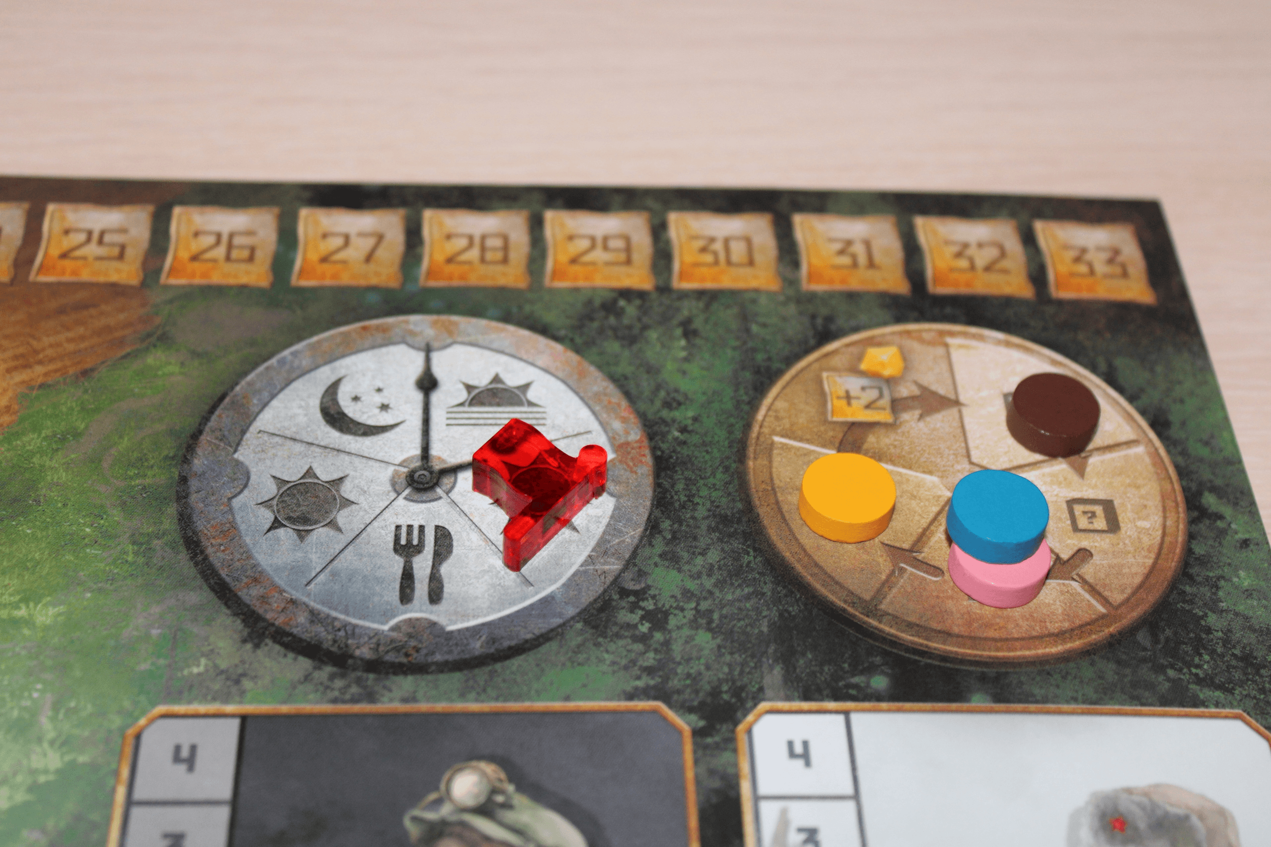 В фазы утра, обеда и вечера ходит каждый игрок, а в фазу первой и второй половины дня должен совершить действие каждый игровой персонаж. В основе игры лежит привычный миплплейсмент. Взяли одного из доступных рабочих и отправили в одну из не занятых трудовых зон. Особенность игры заключается в том, что все персонажи общие и игроки каждый день соревнуются за влияние на персонажей. У каждого трудяги есть шкала настроения, которая может расти или падать в зависимости от действий совершаемых этим персонажем. У каждой фишки есть профильное занятие, которое не снижает настроение. За каждое другое действие рабочему придется расплачиваться хандрой и депрессией. После всех фаз рабочего дня игрок оказывающий наибольшее влияние на персонажа получает или теряет победные очки в зависимости от настроения мипла. Затем все жетоны игроков снимаются с персонажей, возвращаются владельцам и начинается новый игровой день. Локации, производящие ресурсы, в основном тоже привычные: всякие шахты, пастбища, трудовые лагеря и т.д. Есть места которые могут поднять или поменять настроение — пивная и склад, например. Кстати о складе: все товары которые мы производим отправляются туда и являются общими. Любой игрок может прийти на склад и потратить сырье на разные бонусы. За каждый ресурс который произвел игрок, он передвигает свой маркер по шкале производства. Это еще один способ заработать немного победных очков. Еще можно отправлять товары на экспорт, сбрасывая излишки ресурсов со склада и заполняя ячейки экспорта. Такое действие тоже может приблизить игрока к победе.
