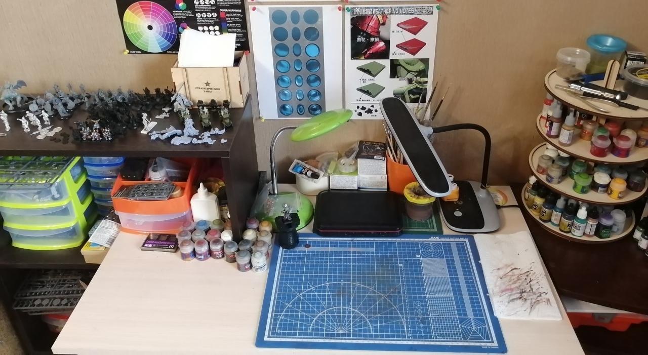 Где красить? Небольшой ЛикБез: чтобы краска хорошо держалась на миниатюре, её хорошо бы загрунтовать. Грунтовка бывает разная: в балончиках, для аэрографа и для кисти. В балончиках грунтовка распыляется и имеет очень сильный характерный запах. От аэрографа частицы краски также потом оседают на всём, что в помещении, плюс нужен ещё аэрограф! Гаража, отдельной мастерской или пустого помещения у меня нет. Красить планирую дома, поэтому автоматический выбор - грунтовка и краска для кисти. Всё что для кисти не имеет запаха, быстро высыхает и удобно хранить в коробке или ящике стола. Всё своё добро храню в коробках из-под бьюти наборов, любезно предоставленных моей любимой супругой, и пустых коробочек Meeple house. Купил коврик в FixPrice, чтобы защитить стол от неаккуратностей. Собственно и всё. А, и самое важное, ЛАМПА!!!