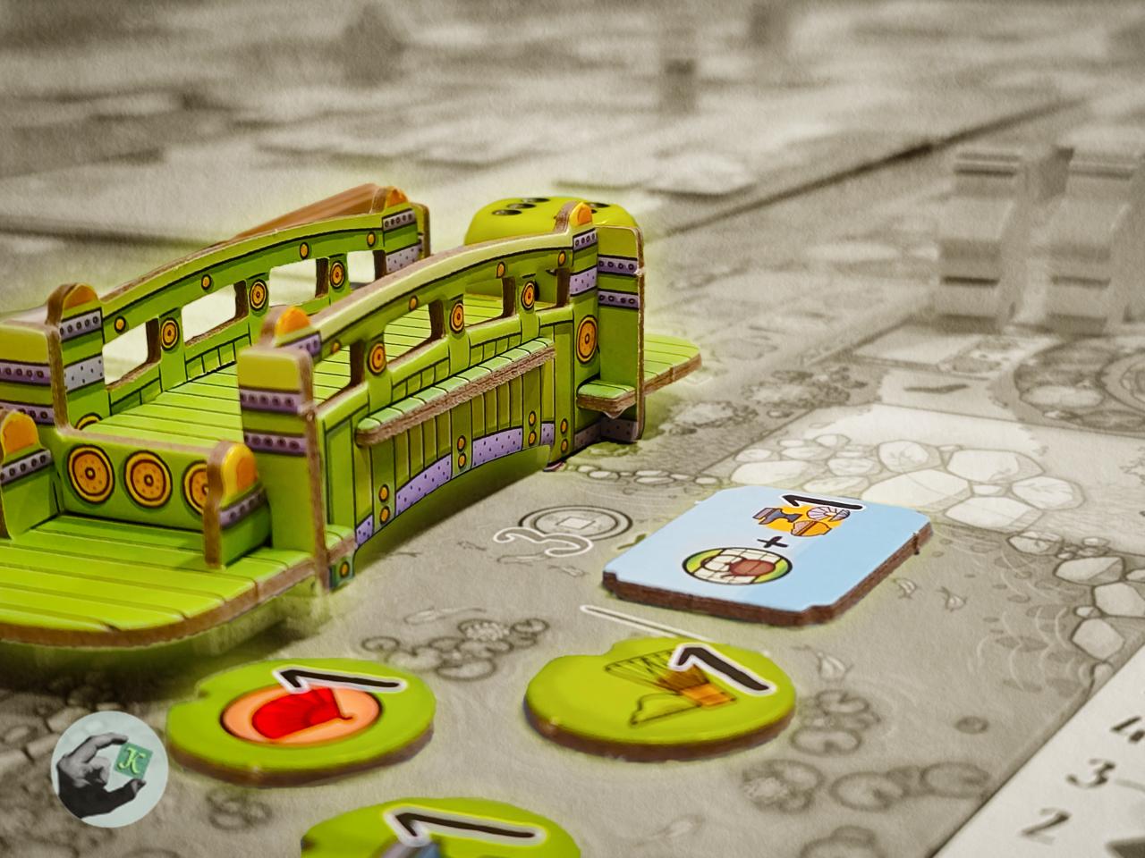 Берём кубас с одного из трёх мостов и выполняем действия в нашем замке. Мосты - не просто картонная приблуда и нервотрёпка для людей с проблемной мелкой моторикой, но и вполне обоснованная игро-механическая изюминка. Размещаемые на них кубы действий идут в строгой последовательности от меньшего к большему. Большие значения в основном берут для получения денег и если ваш соперник уже занял нужную клетку бОльшим значением. Маленькие же значение полезны по-своему - никаких денег, скорее всего, не дадут, но зато позволят активировать ваш «фонарь» - получение ресурсов, количество которых вы вольны увеличивать всю игру.