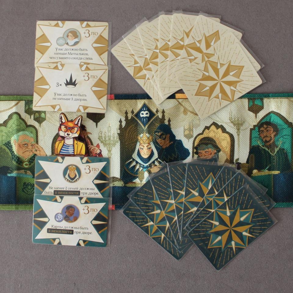 Если семья уважаемая, то у игроков каждая карта этого цвета даст положительные очки. Если семья в немилости у королевы, то — отрицательные очки. Вроде ничего такого, ведь можно в основном ставить карты в уважение королевы. Но дьявол кроется в деталях. У каждой семьи есть особые карты: