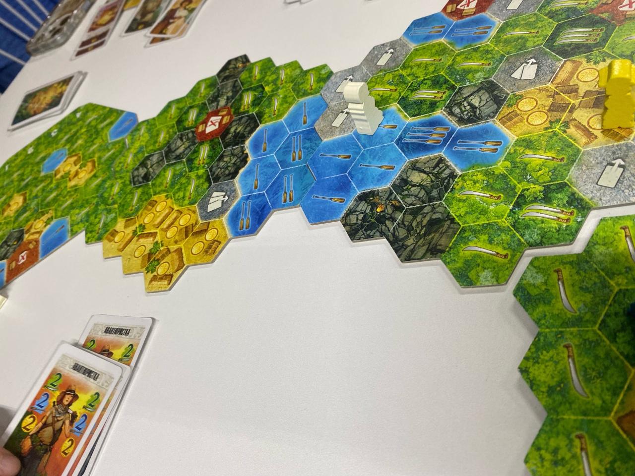 Особенно меня порадовала игра, В поисках Эльдорадо, которую я давно хотел попробовать и к которой в скором времени планируется целая гора допов. Это у нас колодострой-гонка с полустатическим рынком. Механизм действия карт привязан к полю, на котором нам нужно путём разыгрывания своих карт помощников первыми добраться до желаемой цели, а так же к манипуляциям с рынком и колодой. Быстро, весело, конкурентно! Наш выбор! Играть ещё хочется. Из минусов конечно - размеры самой дороги в эльдорадо, и на этом пока и всё.