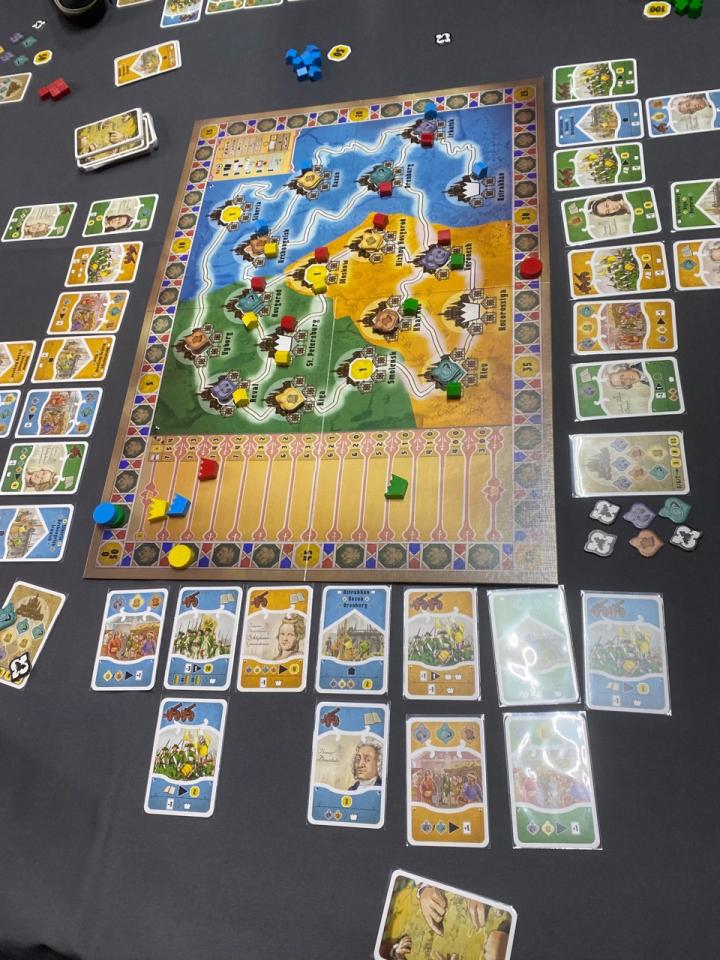 Люблю, когда игры вовлекаются в жизнь. По-традиции играли в одну из самых запоминающихся игр в последнюю очередь. Мы довольно сильно торопились выезжать, отчего игра приобрела оттенок напряженных торопливых важных выборов на протяжении трёх (хоть все готовились и к четырём) раундов, между историческими действующими лицами, военной силой, книжным просвещением, цепями собственных городов, влиянием, гербами, доходом и набором карт и какими-то мутными личными военными генералами, которые требовали от владельцев сброса неприличного количества карт с руки. Игра супер! Сумбурная, непонятная, но кажется очень рандомная и простая. Хочу найти себе и побольше наиграть. Оценка на бгг нещадно захейчена всвязи с выходом игры про Российскую Империю в 2022. Локализации тоже нет. 🥲