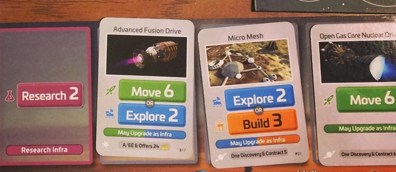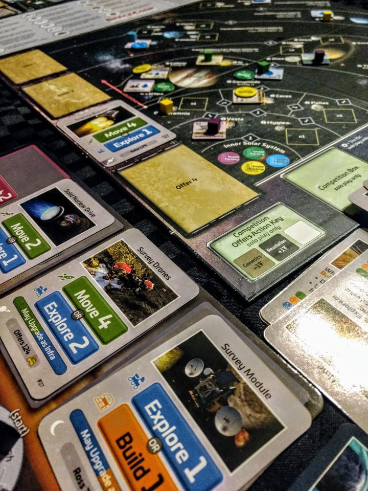 В нашем распоряжении были различные модули и улучшения, позволяющие летать на дальние расстояния (карты с действием движения). Также на "рынке" можно было получить оборудование для исследования и последующей застройки планет, астероидов (всё те же карты, но с другими действиями или их комбинацией)