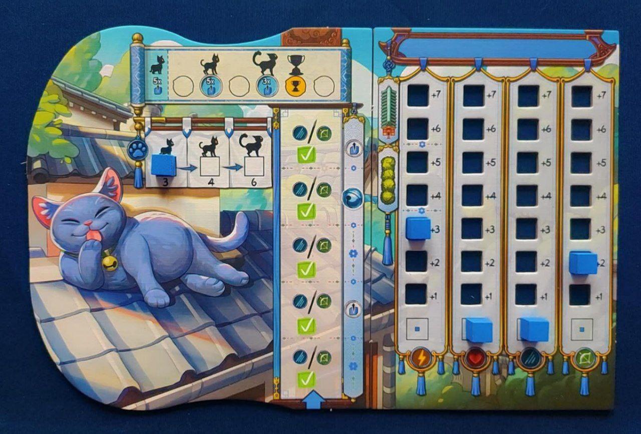 Котики Киото – это увлекательная симуляция кошачей жизни, наполненная приключениями, опасностями и, конечно же, невероятным количеством испытаний. Вся игровая механика построена вокруг системы проверки навыков вашей подопечной кошечки. Её успех зависит от четырёх ключевых характеристик: ловкости, дружелюбия, навыков сражения и охоты. Каждая из них представлена деревянным кубиком на личном планшете игрока, который постепенно будет подниматься выше по мере течения партии и взросления вашего котёнка.