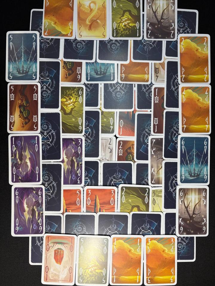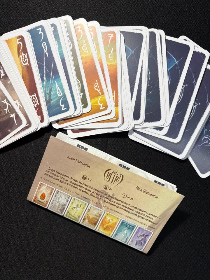 Коробка компактная, всё по делу — 56 карт, из них 49 обычных сиггилов и 7 уникальных карт духов. Каждый дух принадлежит к одному из семи родов, от 1 до 7 по числам. Иллюстрации атмосферные, цвета приятные, оформление в духе мистики и магии. Никаких лишних жетонов, планшетов и прочей мишуры. Только карты и правила. Удобно брать с собой!