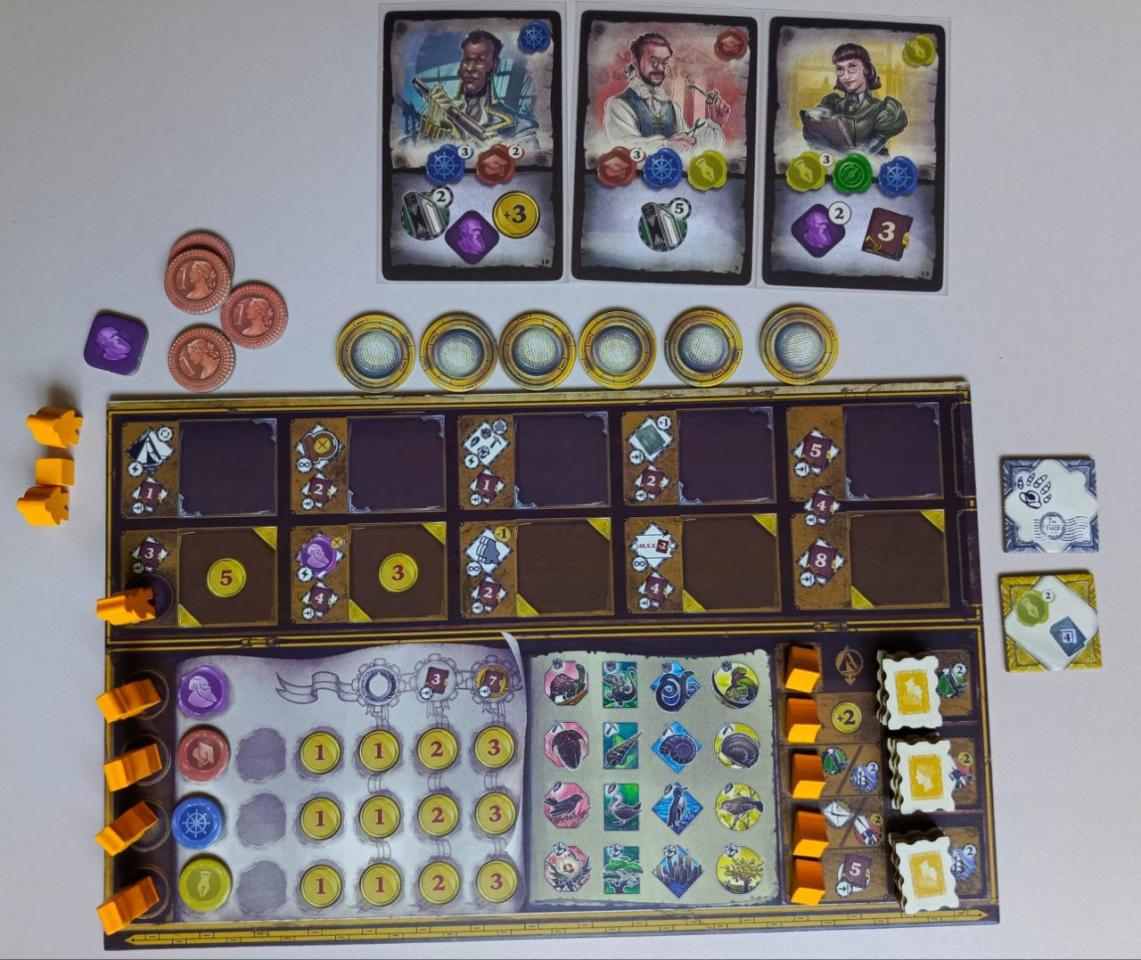 Каждому игроку выдаётся 12 жетонов корреспонденции, 6 жетонов линз, 4 монеты и 3 карты экипажа (выбираются путем драфта). На каждой карте в верхнем углу изображена сургучная печать, каждую из которых игрок кладет каждому своему работнику. У одного из них уже есть фиолетовая сургучная печать - это своего рода джокер, который способен заменить собой печать любого цвета.
