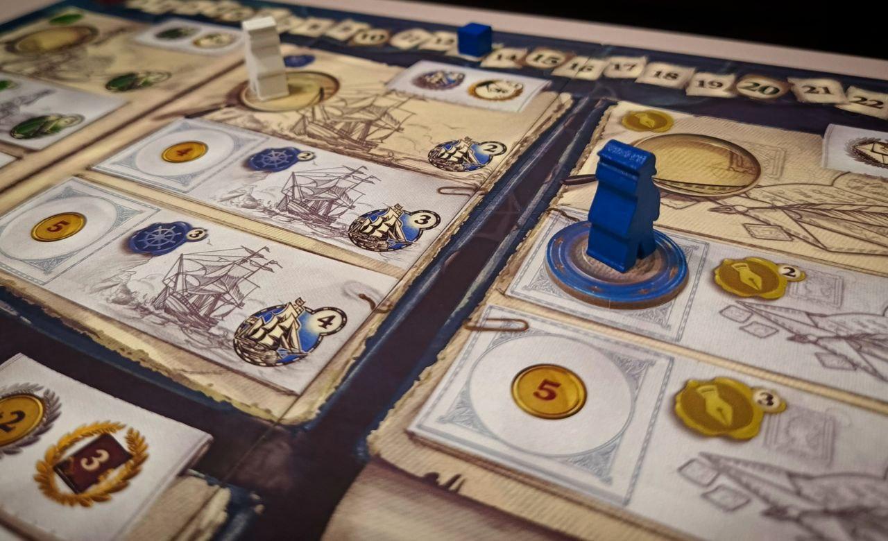 - Плыть. Корабль игрока должен не отставать от Бигля, который каждый раунд (а их всего 5) перемещается на следующую ячейку с якорем. Тем, кто отстал от Бигля, приходится получать штрафные очки, которые отнимаются от очков, полученных за выполнение целей Бигля. Эта система очень похожа на движение по треку выработки энергии из игры "Плотина" - сразу чувствуется рука автора. По пути можно собирать бонусы, изучать образцы, размещать лагеря. И здесь на одну ячейку могут вставать сразу несколько кораблей.