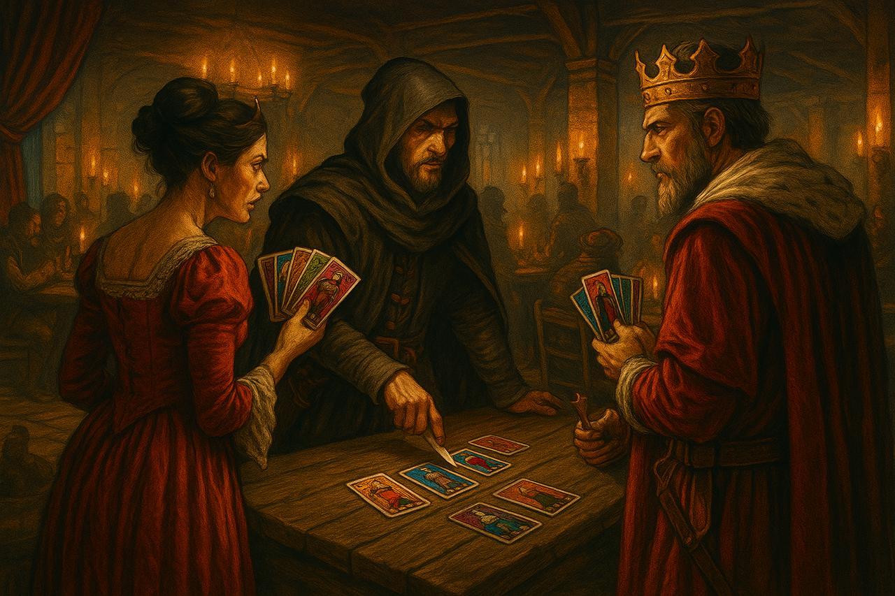 Компоненты. 16 карт по 4 одинаковых персонажа каждого: Король, Ассасин, Королева и Рыцарь. Всё! Но что автор Erwan Ricord (ничем не известен) туда накрутил! Сначала казалось, можно было бы сыграть вальтами-дамами-королями и тузами обычной колоды, но масти в таком случае могут иногда дать столь ценную информацию, которую мы будем пытаться сокрыть от оппонента, а сами стало быть разведать. Именно на этом принципе сокрытия и получения информации и строится игра.