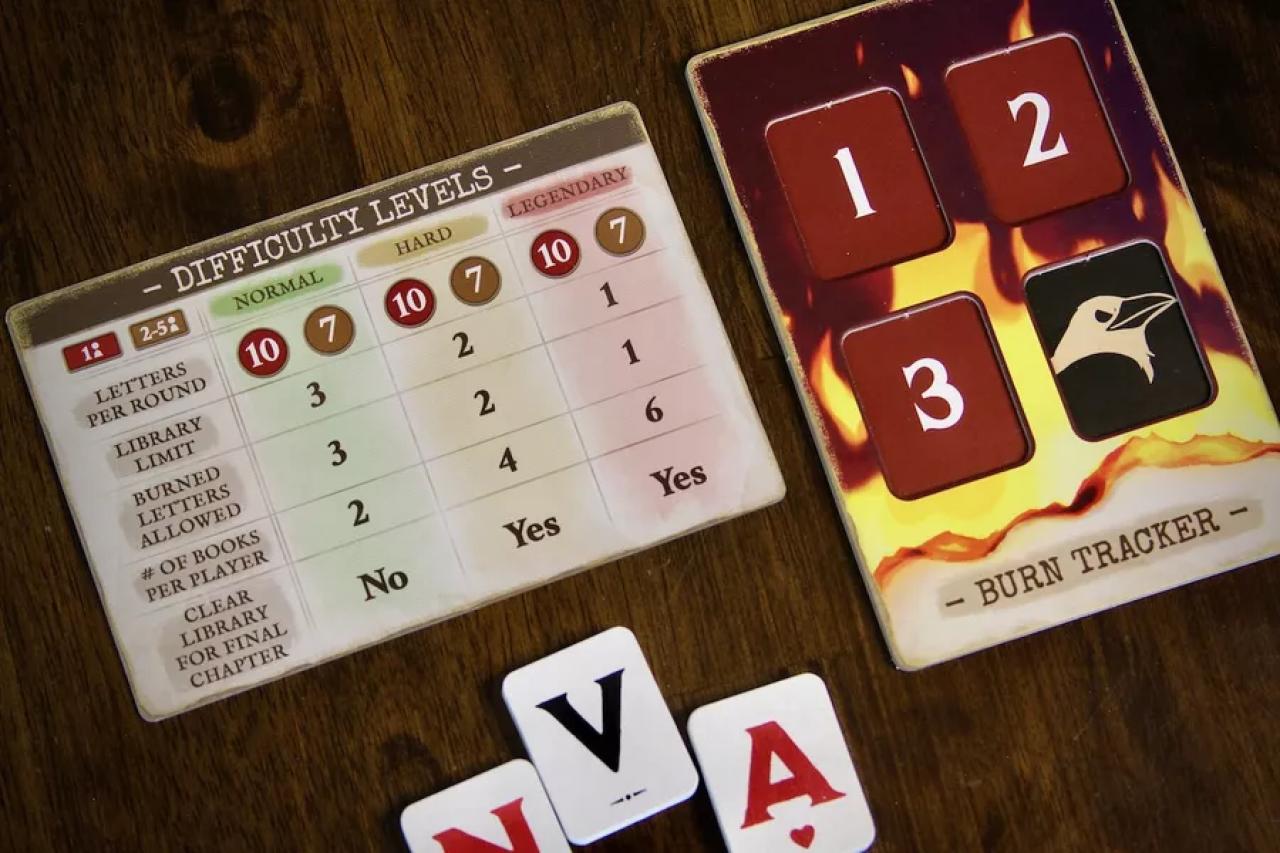 Значительная часть игры — это выживание. Да, конечная цель — выполнить требования книг, но команде нужно работать сообща, чтобы обеспечить использование большинства букв, сохранить их для следующего раунда и предотвратить добавление буквы на трекер сожжения. Большинству игроков потребуется несколько раундов, чтобы накопить достаточно букв для переплёта одной книги.