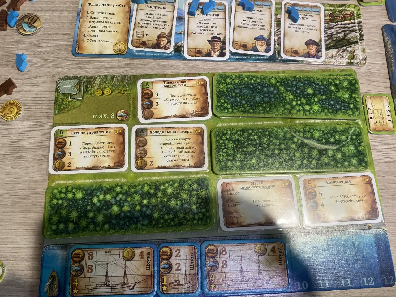 Классическое коричневое (синее) рыбное евро от Уве Розенберга, игр которого я накупил зачем-то на попробовать. Базовая коробка содержит 3 колоды строений, которые будут определять, какие из стратегий вы будете максимизировать, придавая разнообразие партиям. Действий достаточно и автор поработал со всеми возможными путями развития добротно. Однако невариативность выхода старейшнин немного консерватизирует для меня партии. Предварительно начитался и наслушался хвалебных отзывов, поэтому тут даже небольшое разочарование. Но радует короткое время партий, коих удалось отыграть штук 5. По-итогу продано.