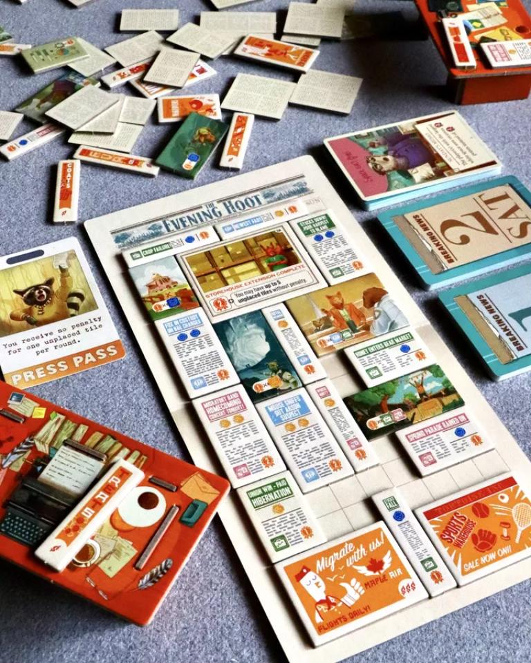 Примерно на том же месте находится для меня эта тоже несложная семейка. Это игра на скорость и качество. Мы — редакторы своей лесной газеты должны правильно отобрать и координировать тайлы новостей, фотографий и рекламы в течение трёх дней (игровых раундов), дабы получить как можно больше очков и хотя бы не меньше всех денег. Настроение статей тоже играет роль! Вобщем, авторы добавили много приятных мелочей как в плане механик, так и в плане визуально-тематической составляющей, что вкупе с ограничением времени создаёт хороший игровой опыт и вполне интересный процесс. Время от времени можно раскладывать.
