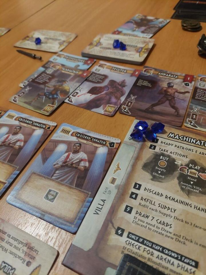 Вторая половина игры посвящена непосредственно кровопролитиям на арене и играется, как заправский скирмиш, но без передвижения: вы определяете инициативу, по очереди проводите атаки своими гладиаторами и играете из руки карты действий, как в ответ на поползновения оппонента, так и для непосредственно какого-то эффекта. Гладиаторов тут куча, всё они с разными активными и пассивными свойствами и характеристиками, а до кучи сюда ещё иногда вмешиваются т.н. патроны (специальный тип карт, покупаемый в предыдущую фазу) и специальные свойств мест сражений, которые иногда буквально переворачивают всё с ног на голову.