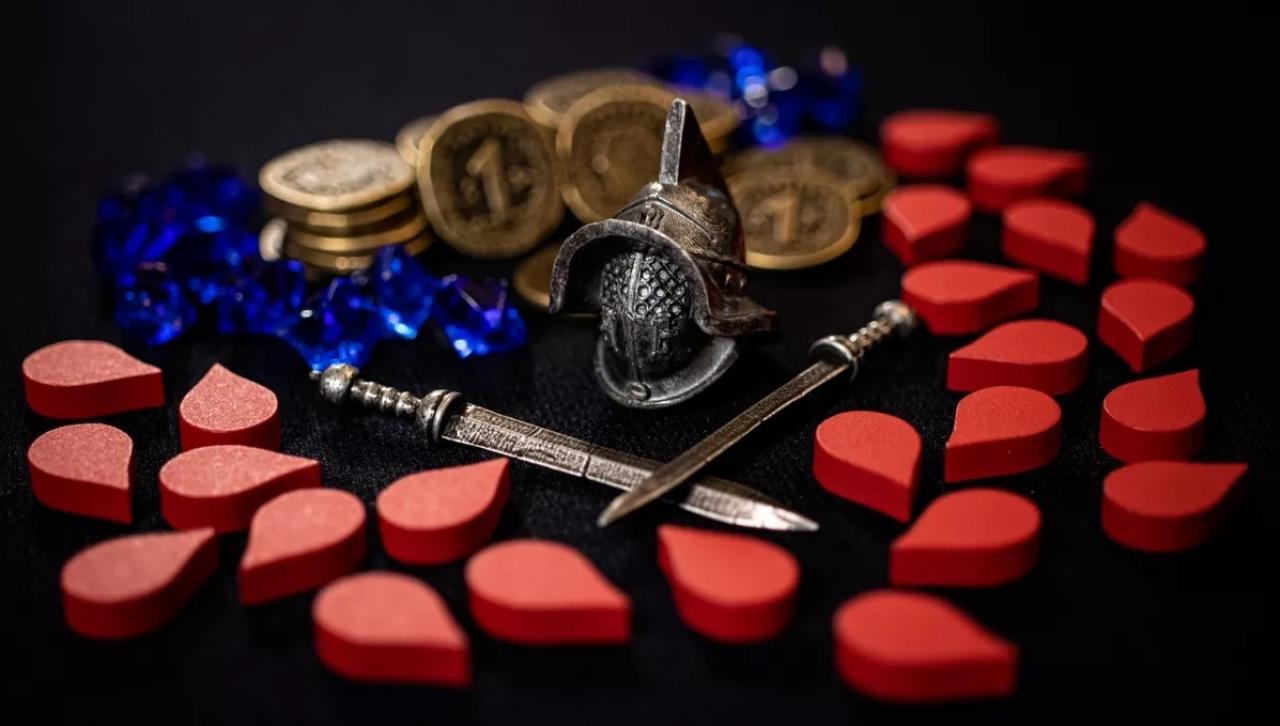Итак, по внешнему виду на мой вкус всё получилось очень и очень: фактурные арты, приятные компоненты, годный органайзер, который держит ВСЕ КАРТЫ БАЗЫ И ВСЕХ ДОПОВ В ПРОТЕКТОРАХ (ну, мб только колода автомы не влезает) - всё это чувствуется весьма прикольно и к месту, учитывая сеттинг. Отдельно отмечу кровищу, которая тут буквально через карту встречается, что вроде бы подспудно и ожидаешь от игры про гладиаторов, но всё же в настолках можно встретить далеко не всегда.